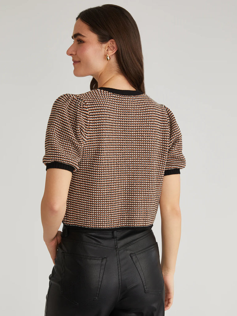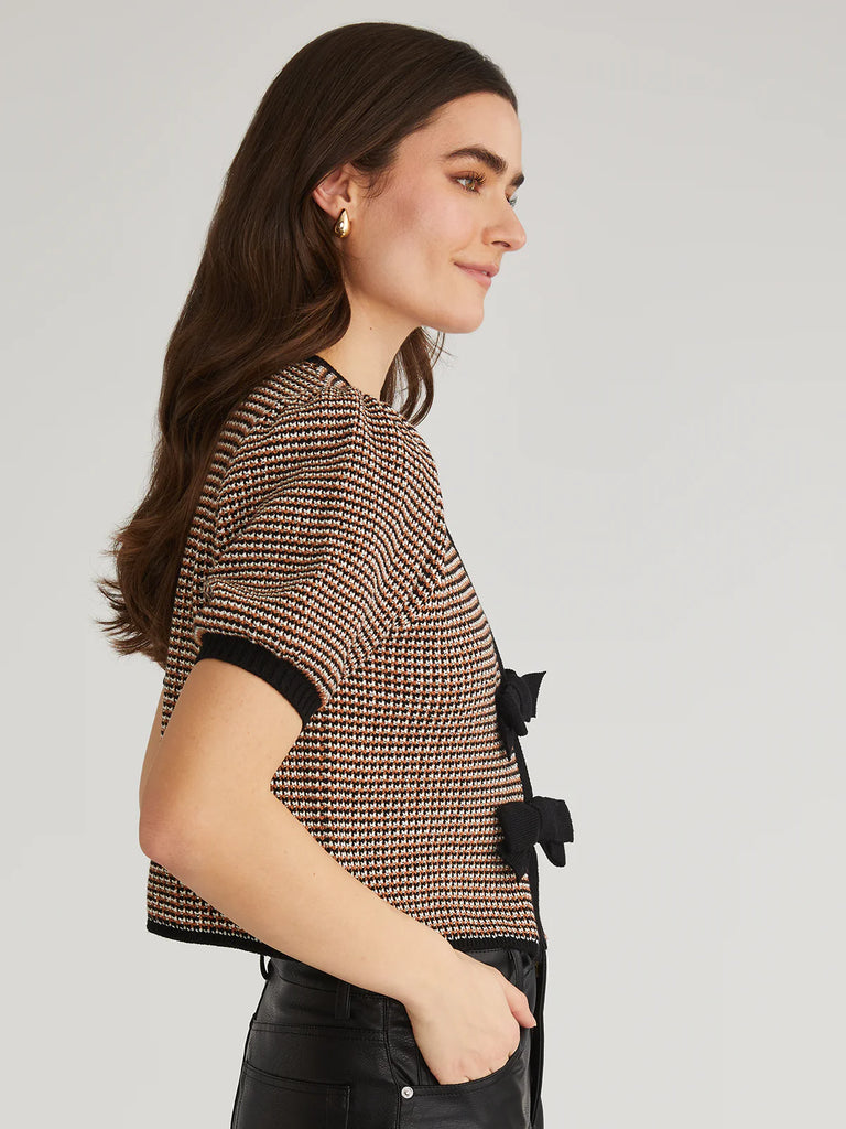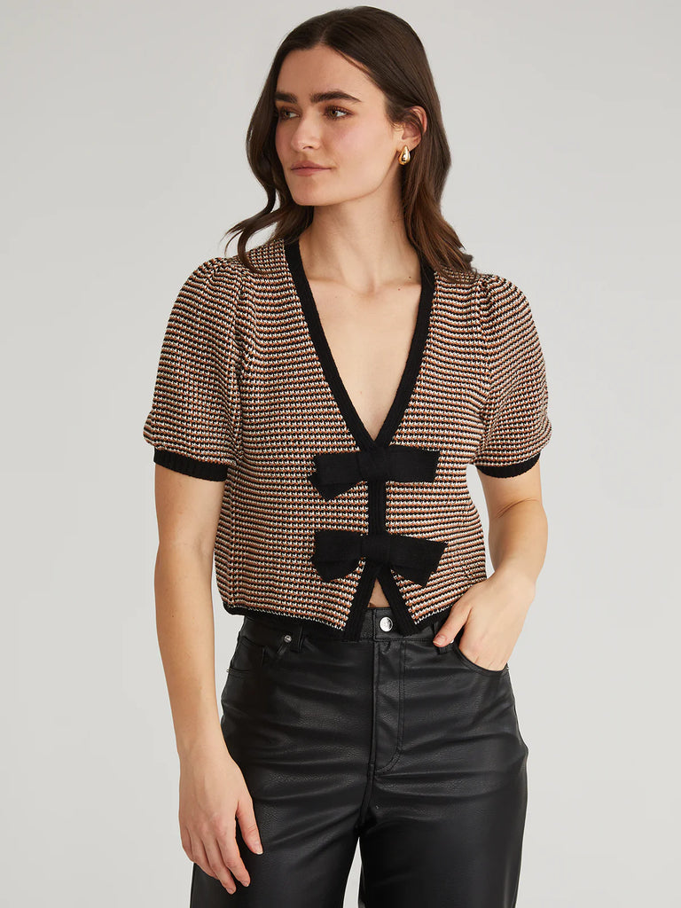 Introducing Elaine: the feminine cardigan with a twist. Its V-neck, short puff sleeves and rib trim add style, while the bow ties on the front give it a touch of femininity. Stay stylish and cozy with this must-have addition to your wardrobe.