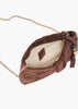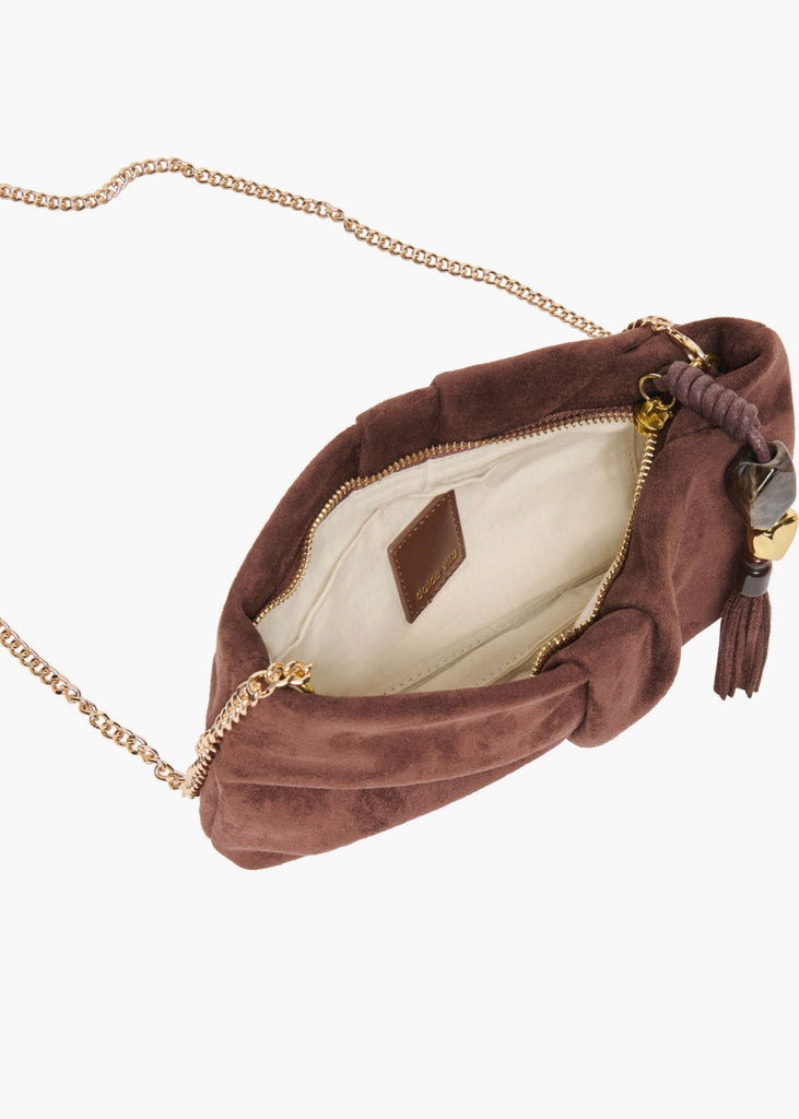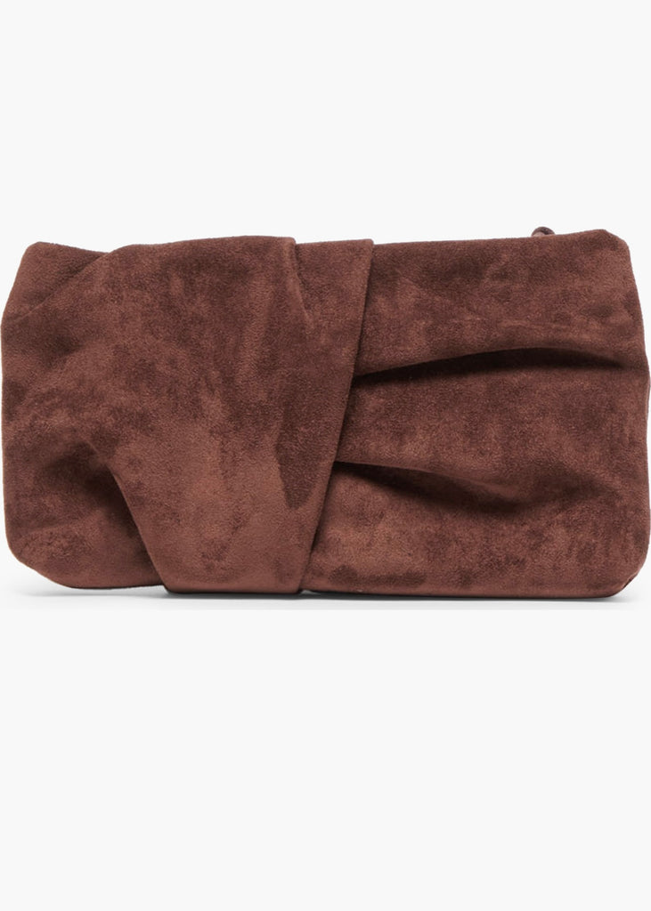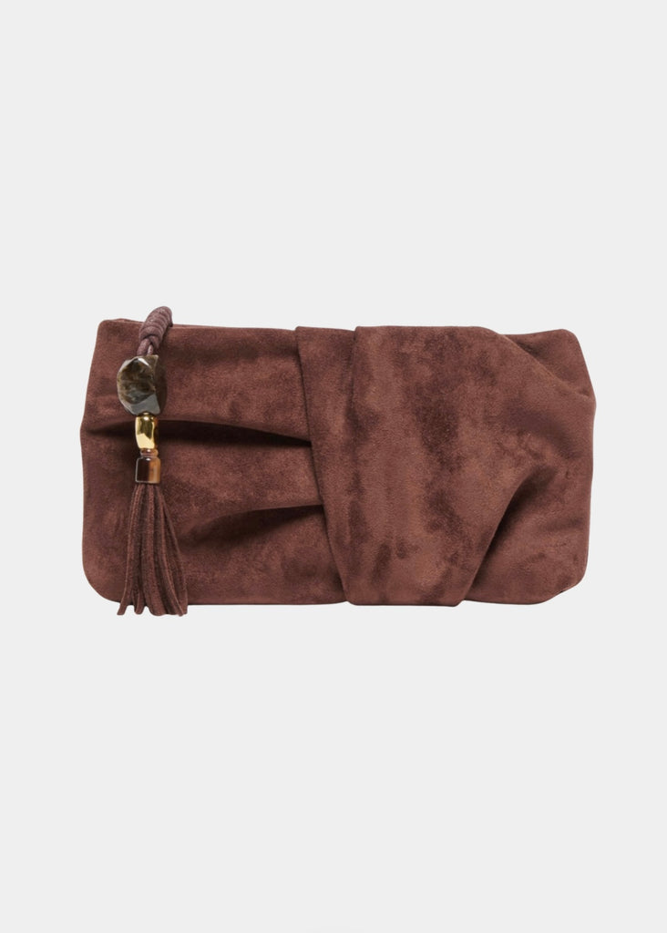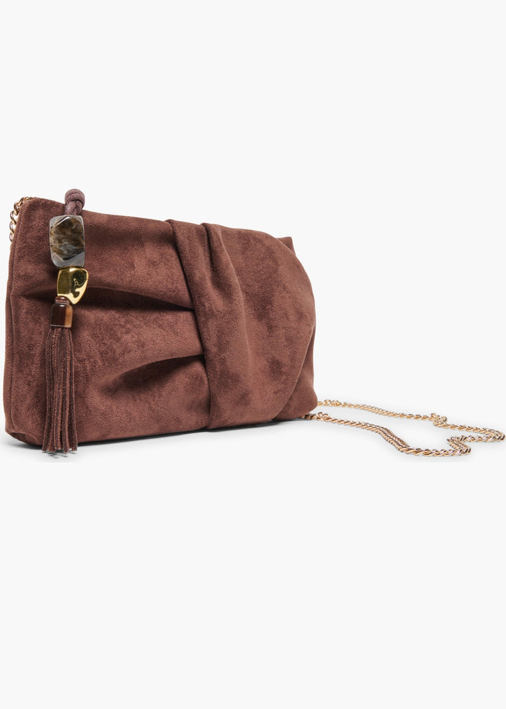 An essential, this faux suede clutch pairs effortlessly with dinner dates and brunches. The chic silhouette features a gathered, knotted-like design at the front, while the zippered top boasts a beaded tassel for an elevated finish. Create a crossbody look with the detachable gold chain link strap.