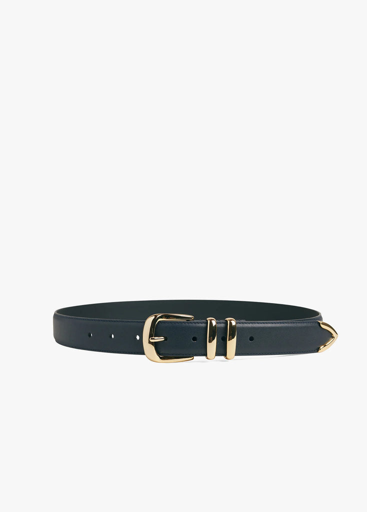 Buckle up--The Jordan Belt will be your new favorite accessory. This 30mm navy belt is crafted from soft and supple leather with feather edge detailing and polished hardware. We especially love the seven prong holes that make it easy to adjust sizing so you can wear it slung at the hips or buckled at your waist.