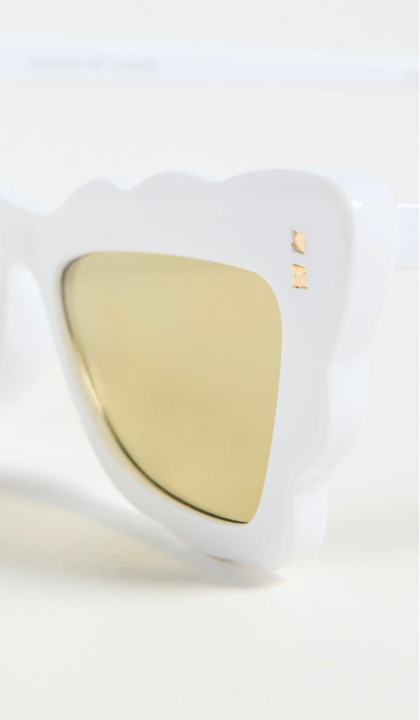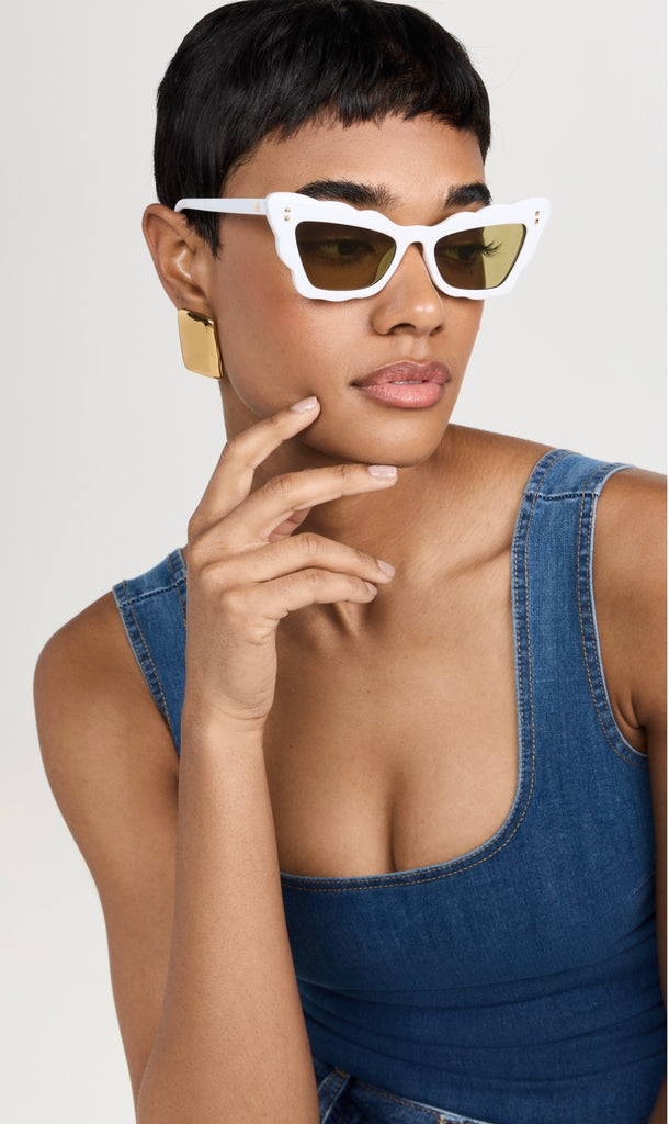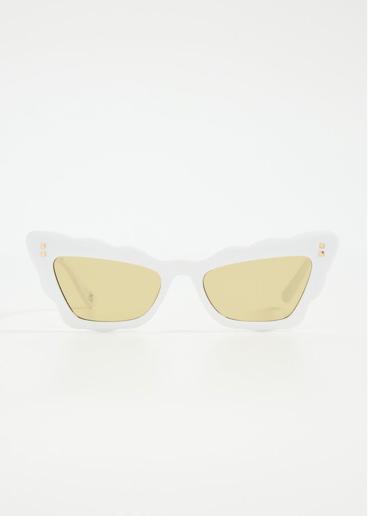 Scalloped cat-eye frames bring a flirty vibe to these glamorous sunglasses fitted with full-coverage UV-protective lenses.