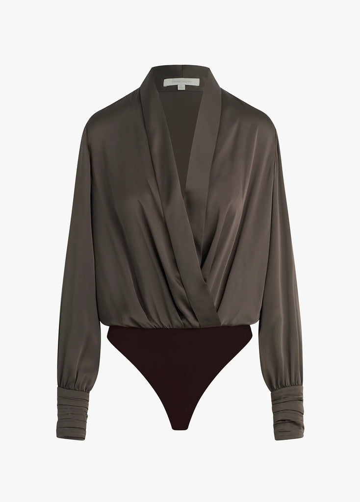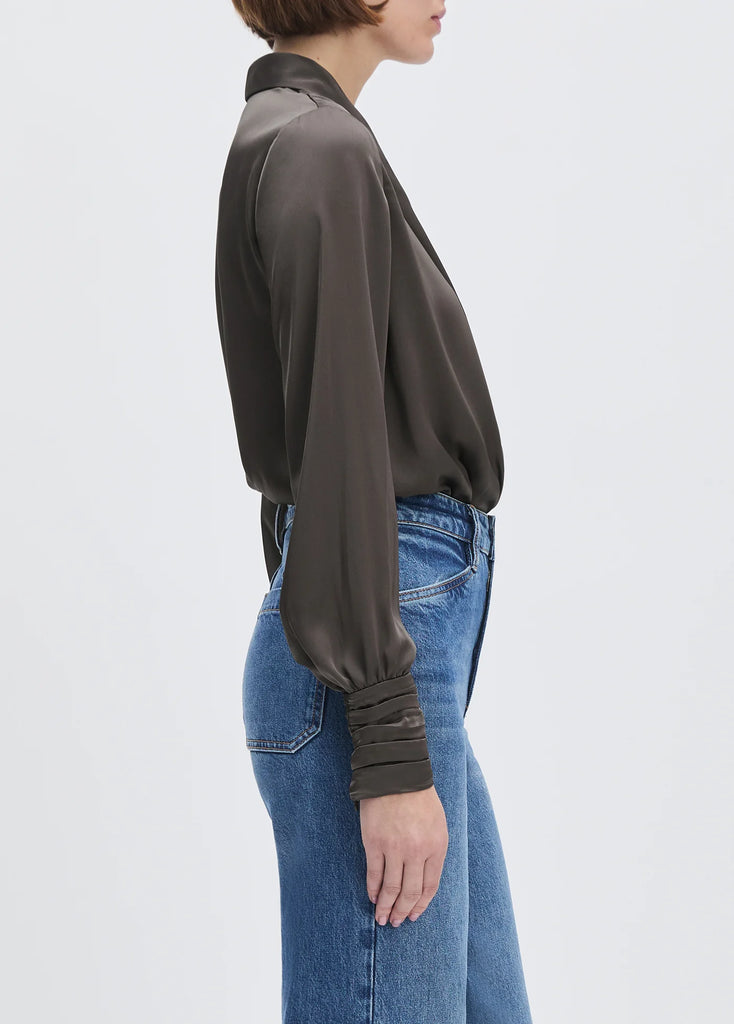A new spin on a favorite. The Better Off Bodysuit takes the best parts of our best-selling Date Blouse (silky satin, blouson crossover styling) and gives it a fresh look with pleated zip cuffs.