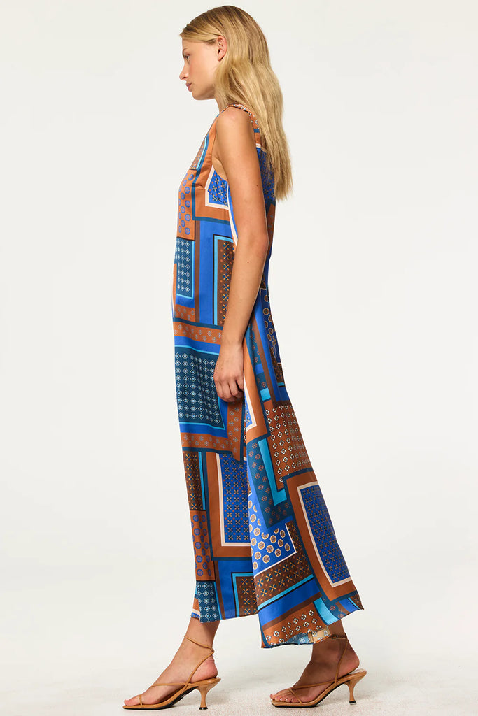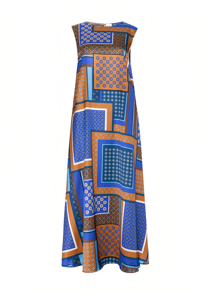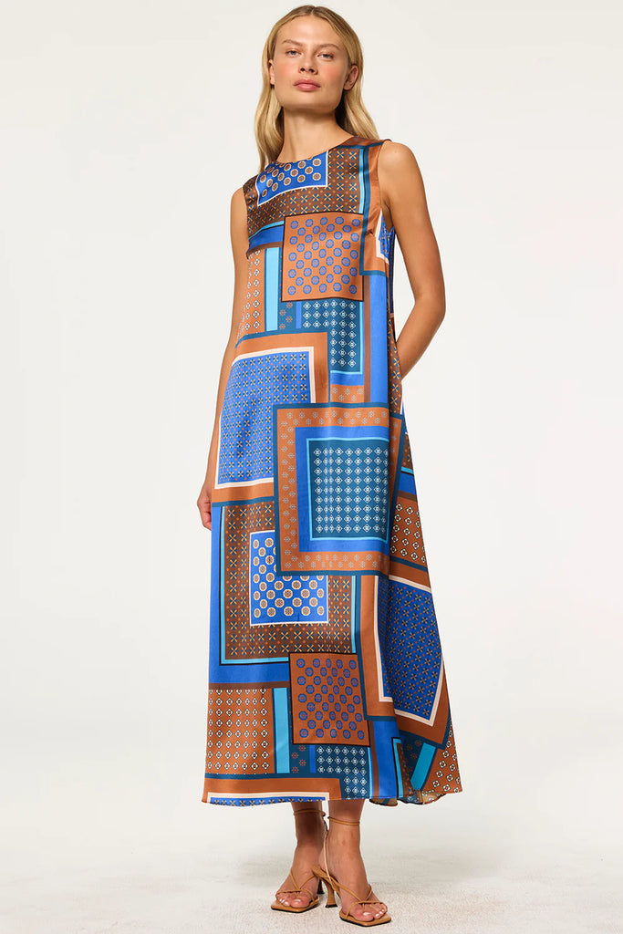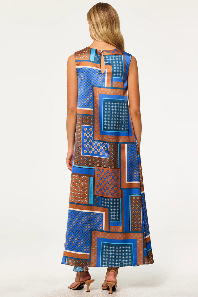 Sylvie is a striking satin, shift maxi dress, cut in a tiled print with rich brown and electric blue hues. This modern, flowing, sleeveless silhouette features a crew neckline with a keyhole button-back closure. Pair it with a simple heel or flat for a look that will carry you through this season and beyond.