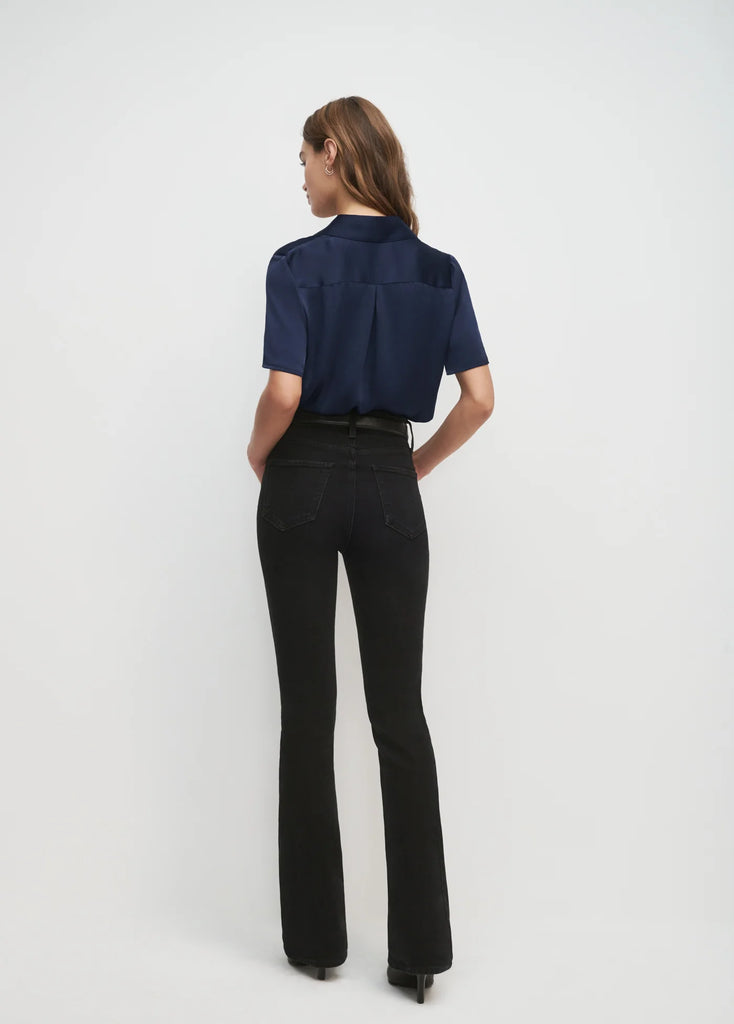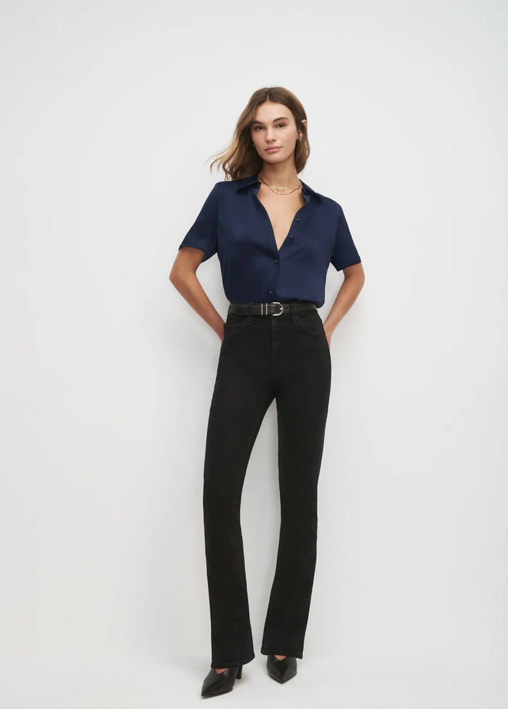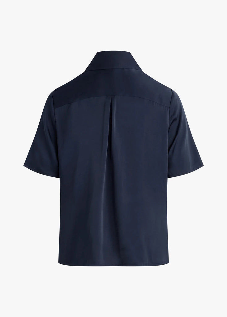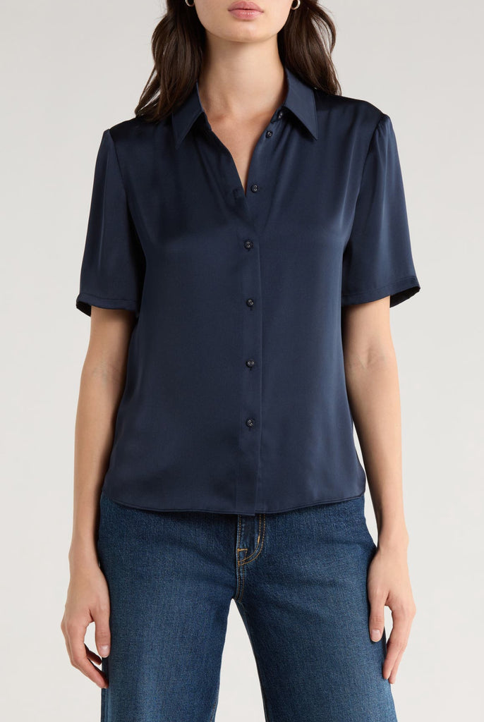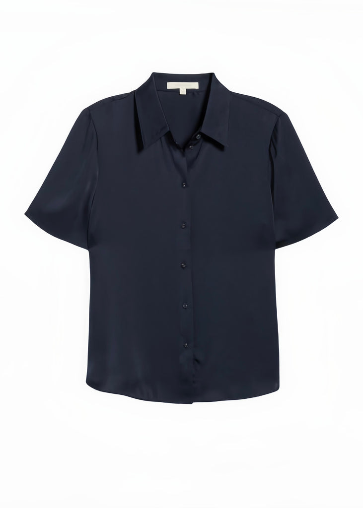 A silky, satin button-down shirt with serious style. The Take Me Seriously Top features a collared neckline and short sleeves. With a tailored fit, this Navy top is sure to be an everyday wear. Wear under the navy pinstripe Favorite Blazer for a timeless & elegant look.