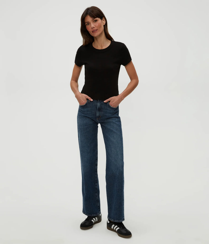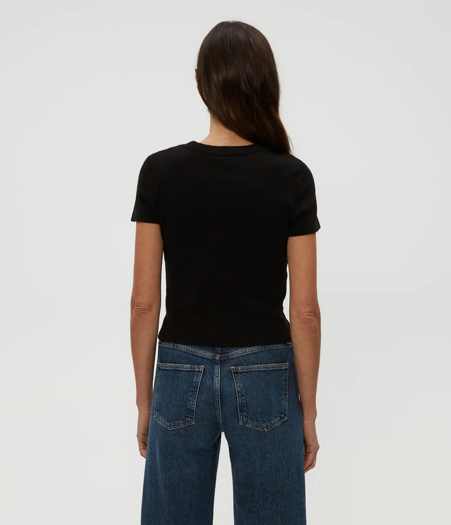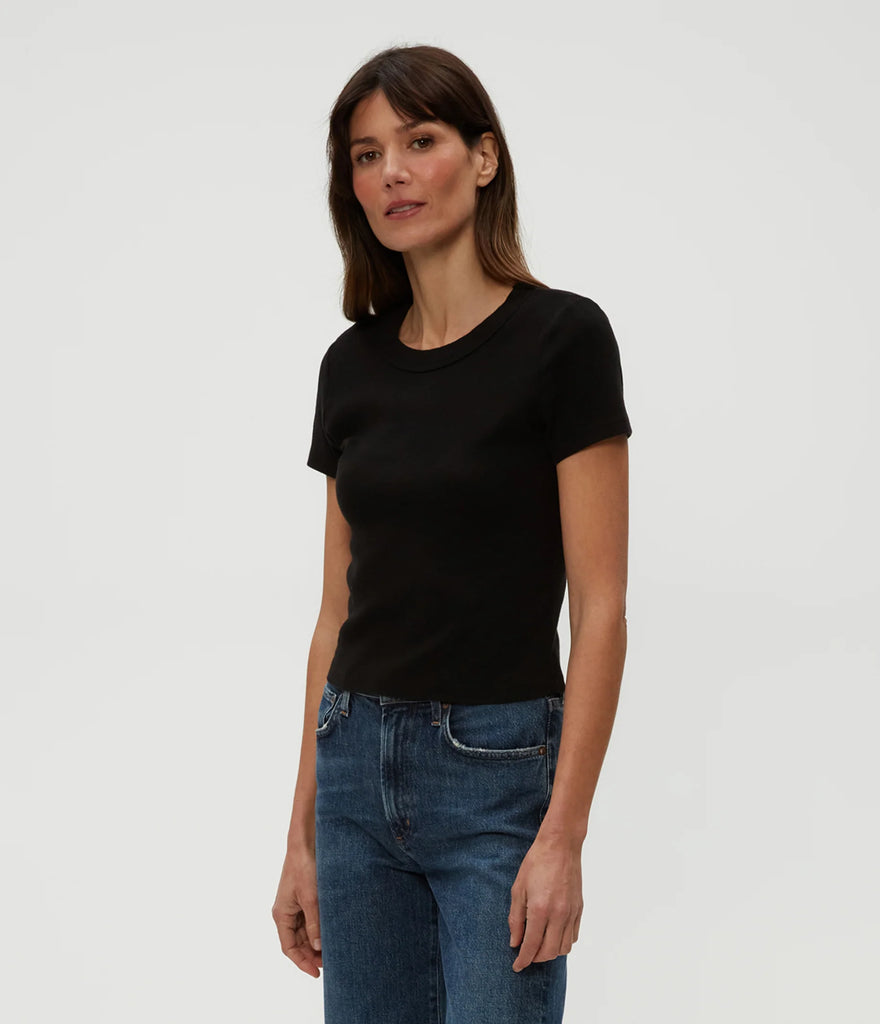 The better than basic cropped tee. Mimi has a crewneck with short sleeves and a slightly cropped hem that hits just at the waistband and a "shrunken" body-skimming silhouette. Made from Michael Stars' bestselling 1x1 Cotton fabric that is a heavier weight cotton rib that washes well and keeps its shape.