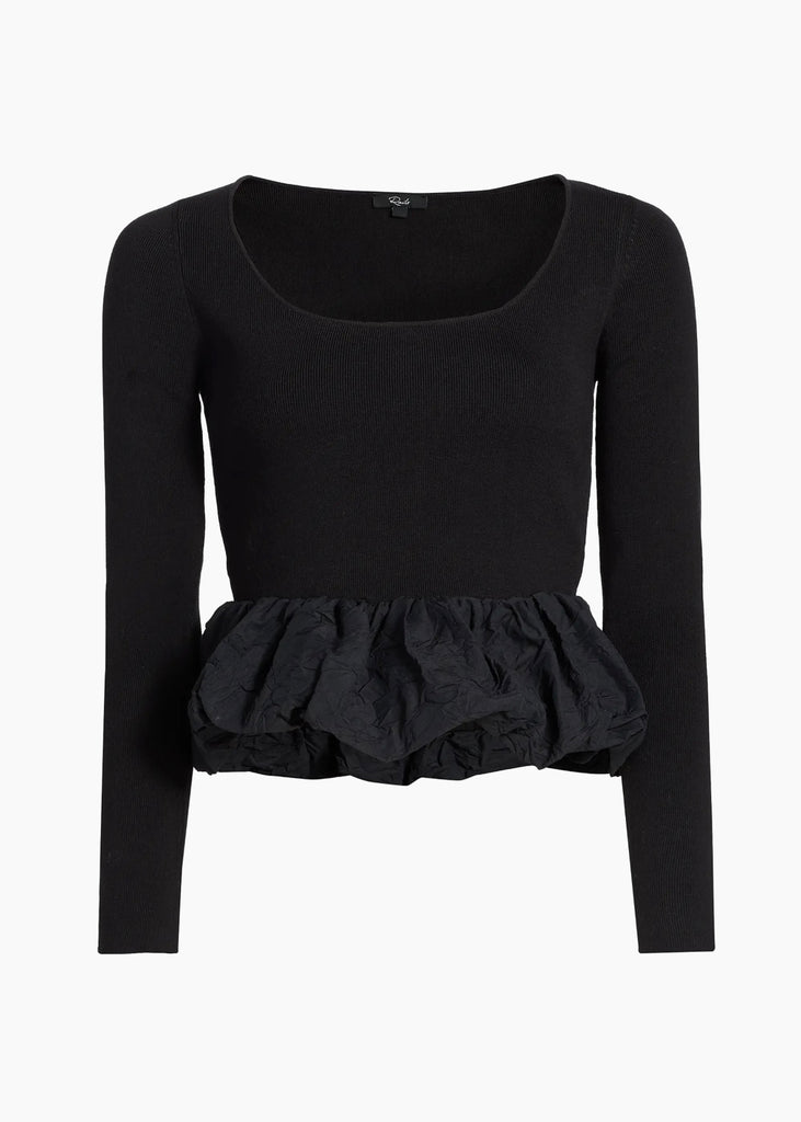 The Tillie is a fitted, long sleeved top crafted in a fine-gauge knit. A contrast poplin ruffle adds interest at the hem.