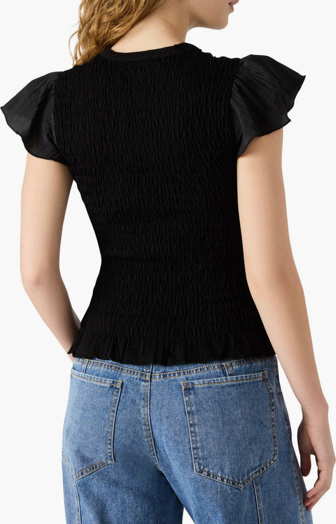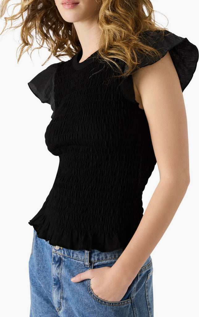 Ruffle sleeves and sweet smocking shape the silhouette of this charming cotton top punctuated with a fluttering frilled hem.