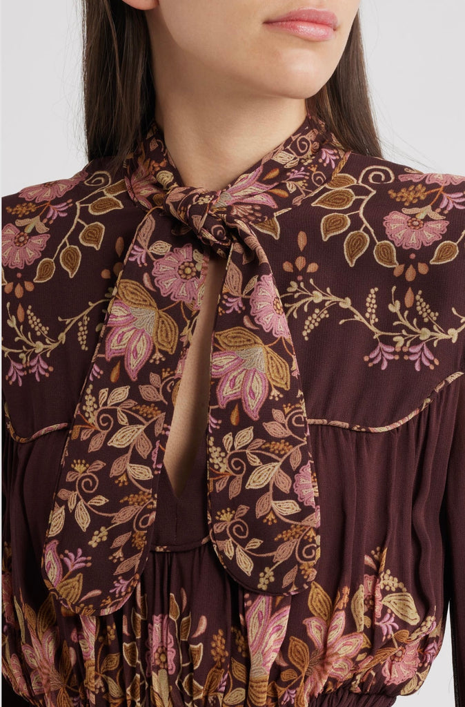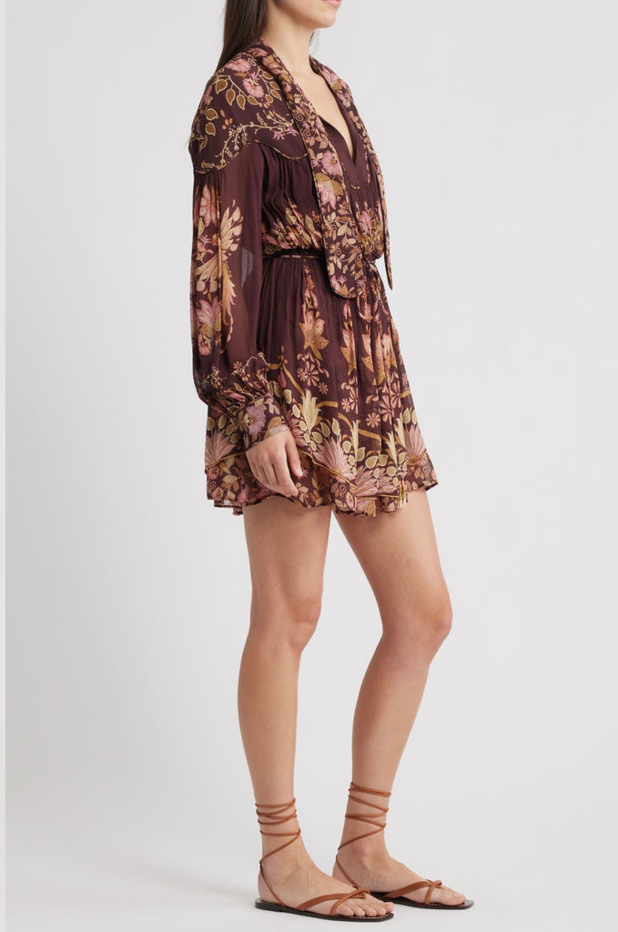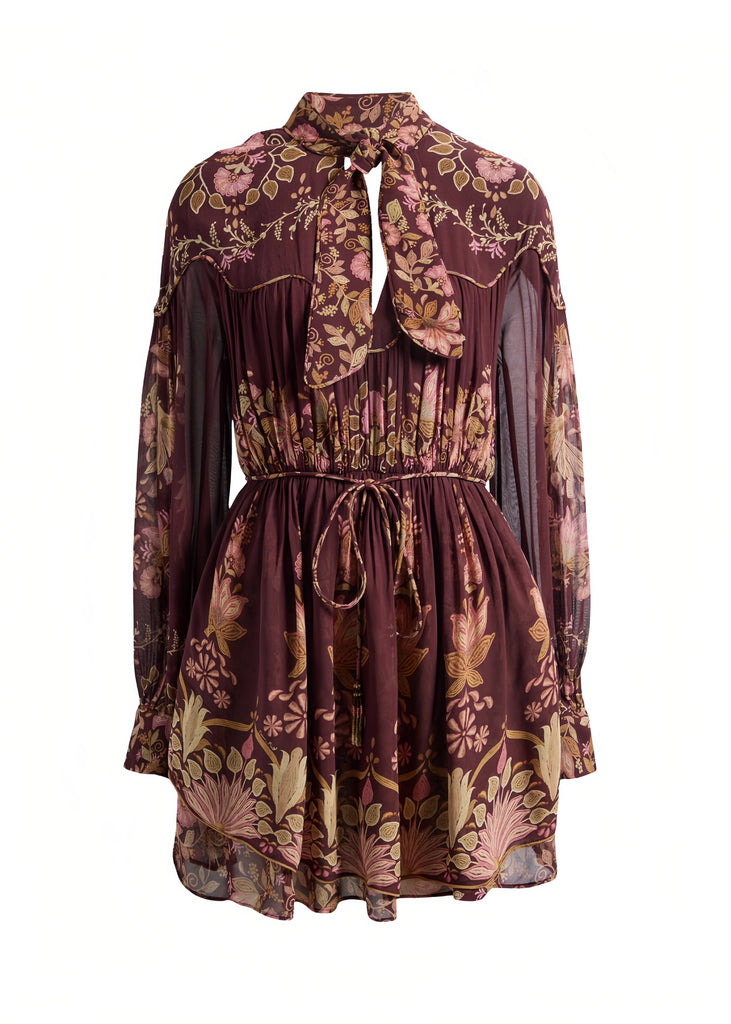A scarf-tied keyhole neck adds a fun flourish to a flower-powered dress cut to a leg-baring length.