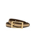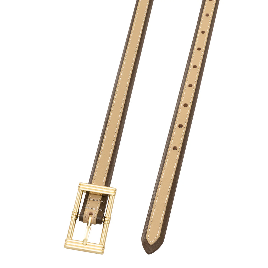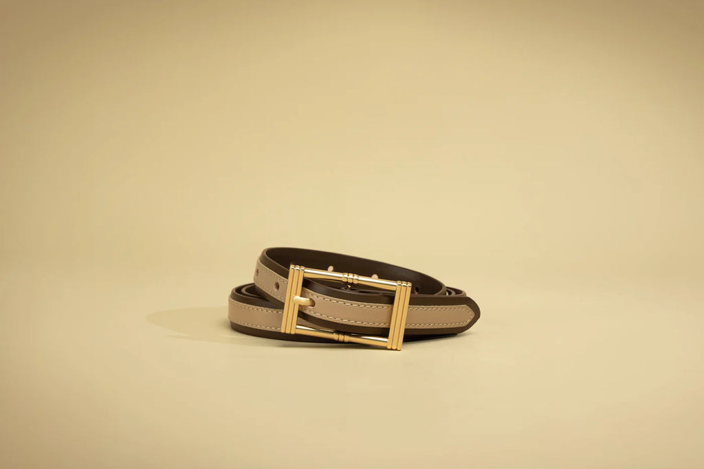 Introducing a new technique for SANCIA, the Olinda belt puts focus on our signature leathers. This two-tone contrast leather belt is finished with a brushed gold buckle designed in-house. The minimal rectangular buckle is highlighted with a ribbed technique on either end. Wear for many seasons to come and get creative with endless styling options.
