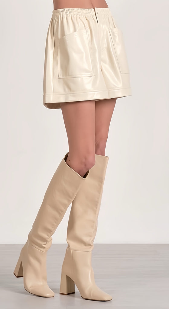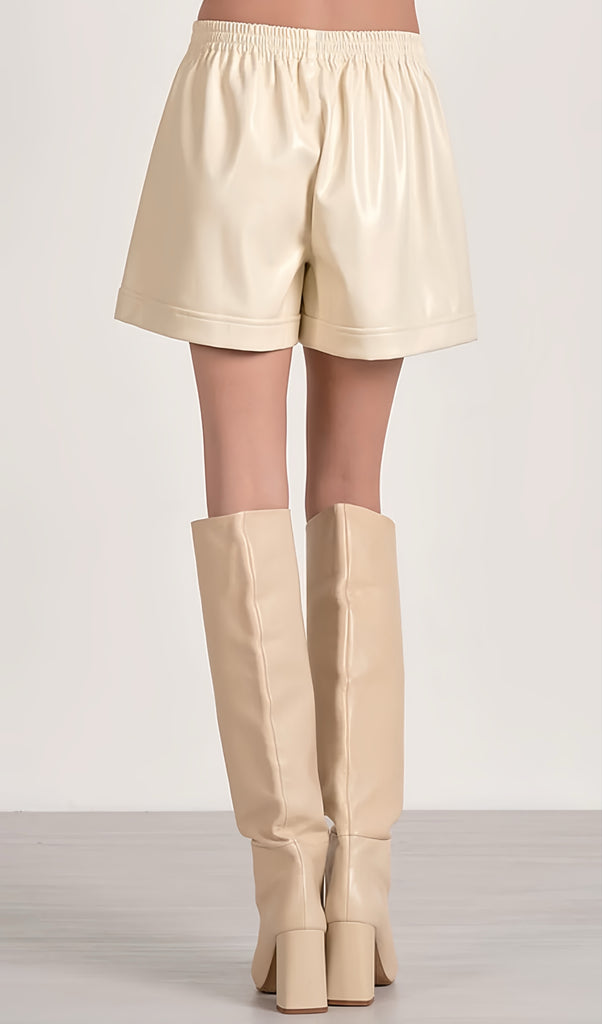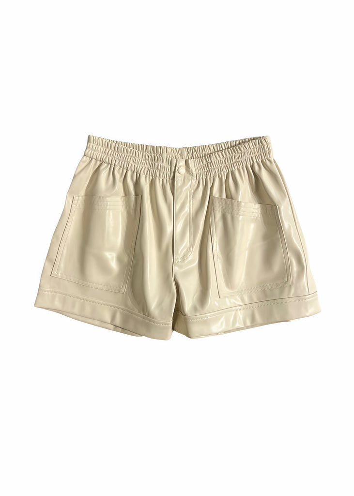 Crafted from sleek faux leather and featuring an elastic waistband for a comfortable fit, these shorts combine edgy appeal with everyday ease. The zip button closure ensures secure wear, while front pocket detailing adds a touch of practicality and style. Perfect for day or night, these fun shorts will be an essential in your fall wardrobe.