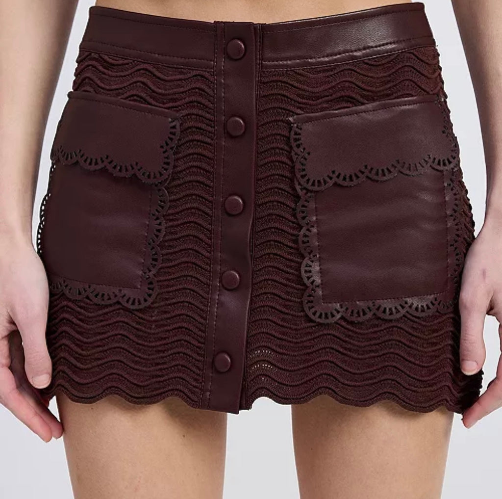 The Delphine knit mini skirt features a sophisticated mixed media design that artfully combines texture and style. Its standout, contrast faux leather details add refined detailing. The scalloped hem completes the look with graceful curves, making this skirt an elegant choice for polished, contemporary wardrobes. Pair with the coordinating Delphine Knit Polo for a cute, matching look. It also pairs well with a tonal sweater.