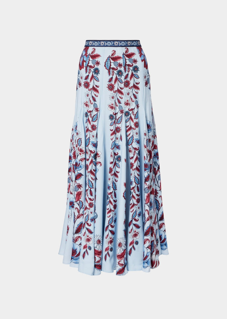 A flower-print banded border defines the waistband of this lovely, silky maxi skirt flared below the knee by godets.