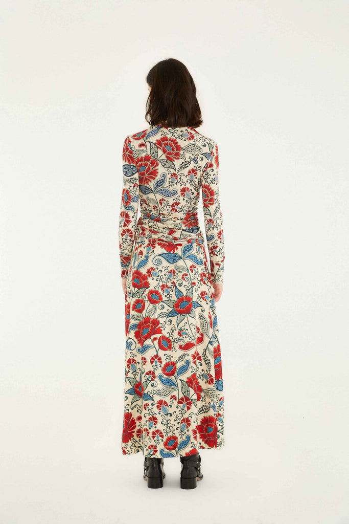 Flowing with a serene maxi silhouette, the Sand Francesca Lenzing® Ecovero® Viscose Maxi Skirt captivates with its generous floral print in warm reds and soft blues over a sandy base. Crafted from eco-friendly Lenzing® Ecovero® viscose, it gracefully drapes while embracing sustainability.