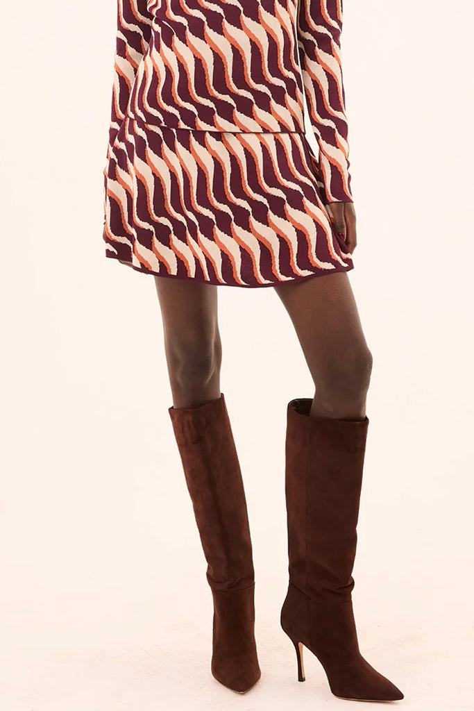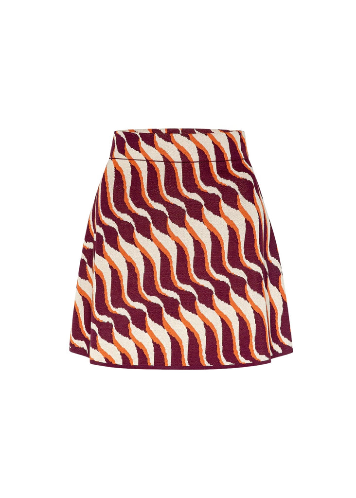Orlie is a chic stretch jacquard knit mini A-line skirt in a bold Autumnal Wave print. Designed in an easy pull-on style, it pairs perfectly with knit tops or satiny blouses for a striking look.