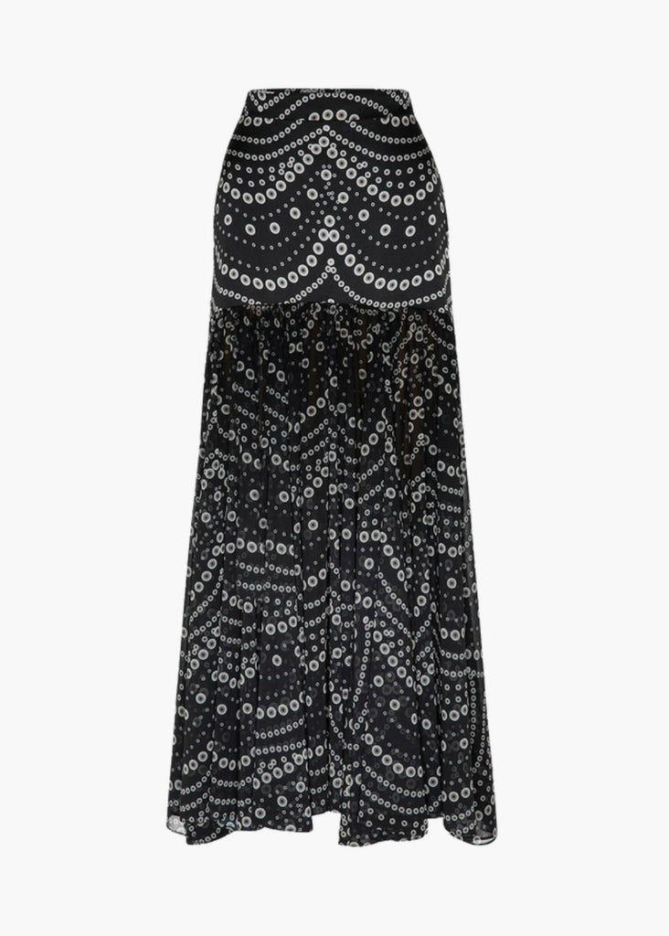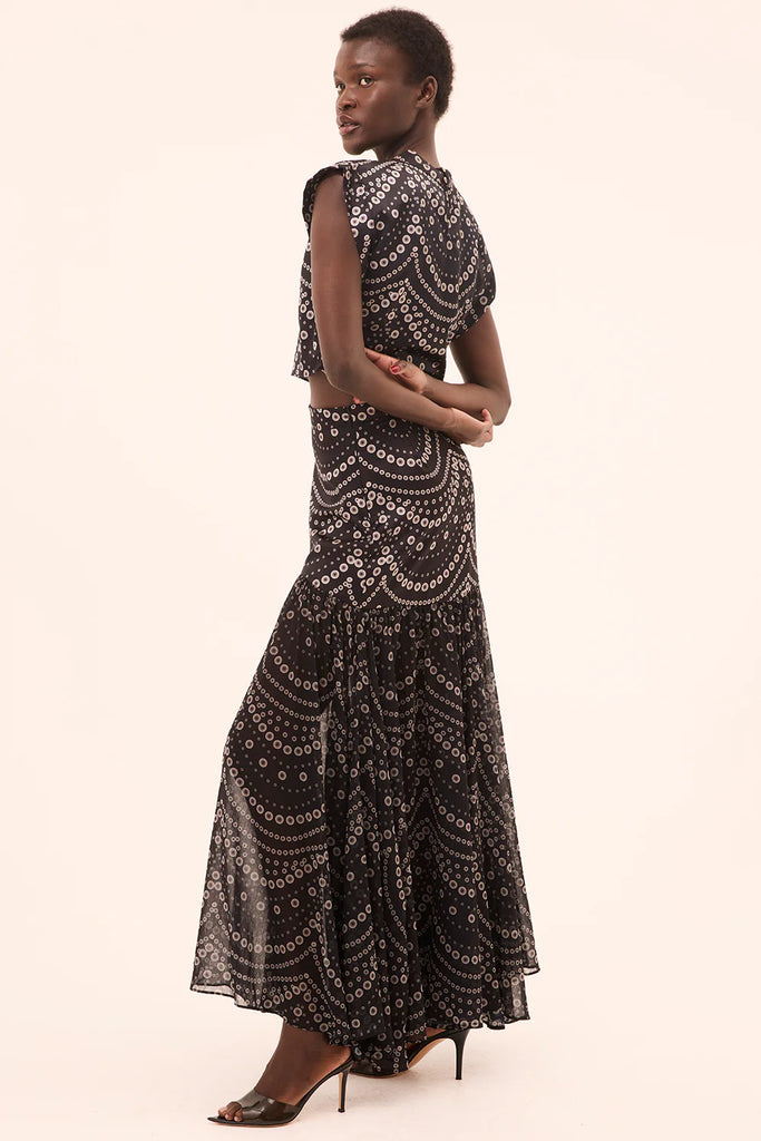 Stun in MISA’s new Yara maxi skirt. This chic drop-waist silhouette features a fitted satin waist that extends to the mid-thigh, where a curved seam meets a flowing, self-lined chiffon skirt in our eye-catching Stranded Pearl satin. Finished with a banded waist and hidden side zip closure. Complete the look with the coordinating Inah top for an effortlessly elegant, event-ready set. We also love it paired with a knit top/sweater and boots!