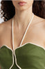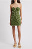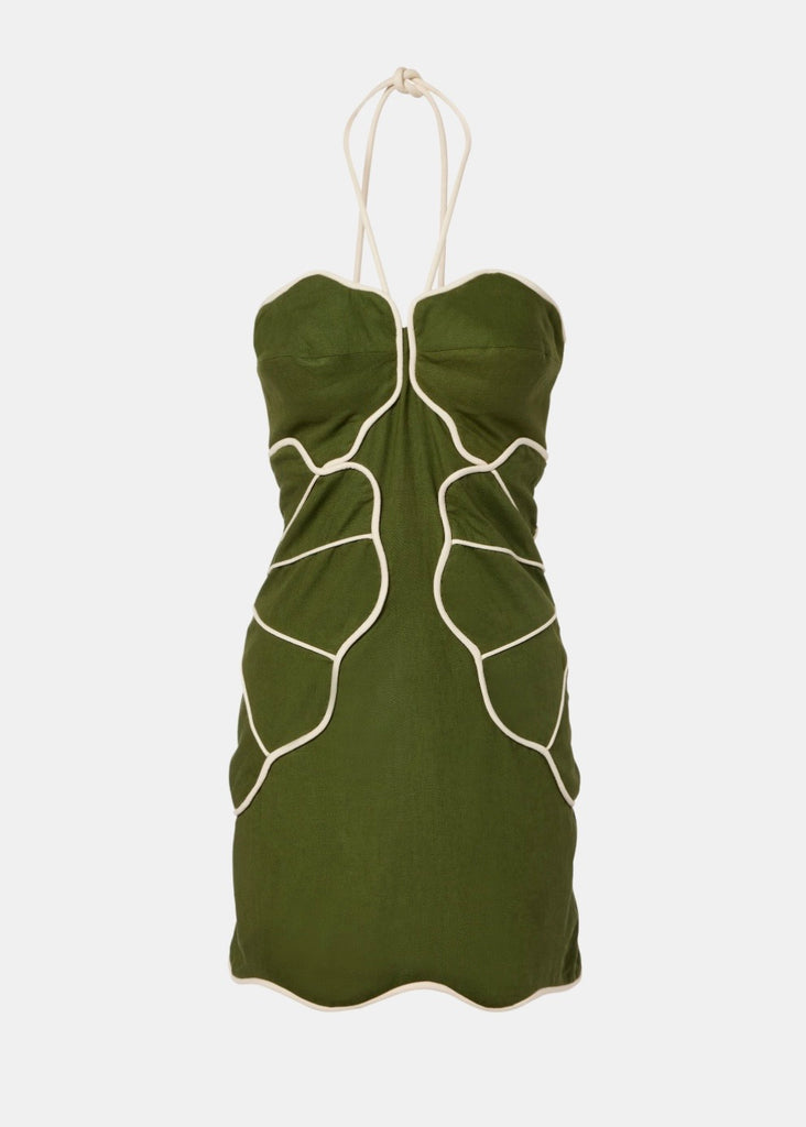 A leafy design enhances the vacation-perfect vibe of this mini cut from a lightweight linen blend and meant to show off your shoulders and back.
