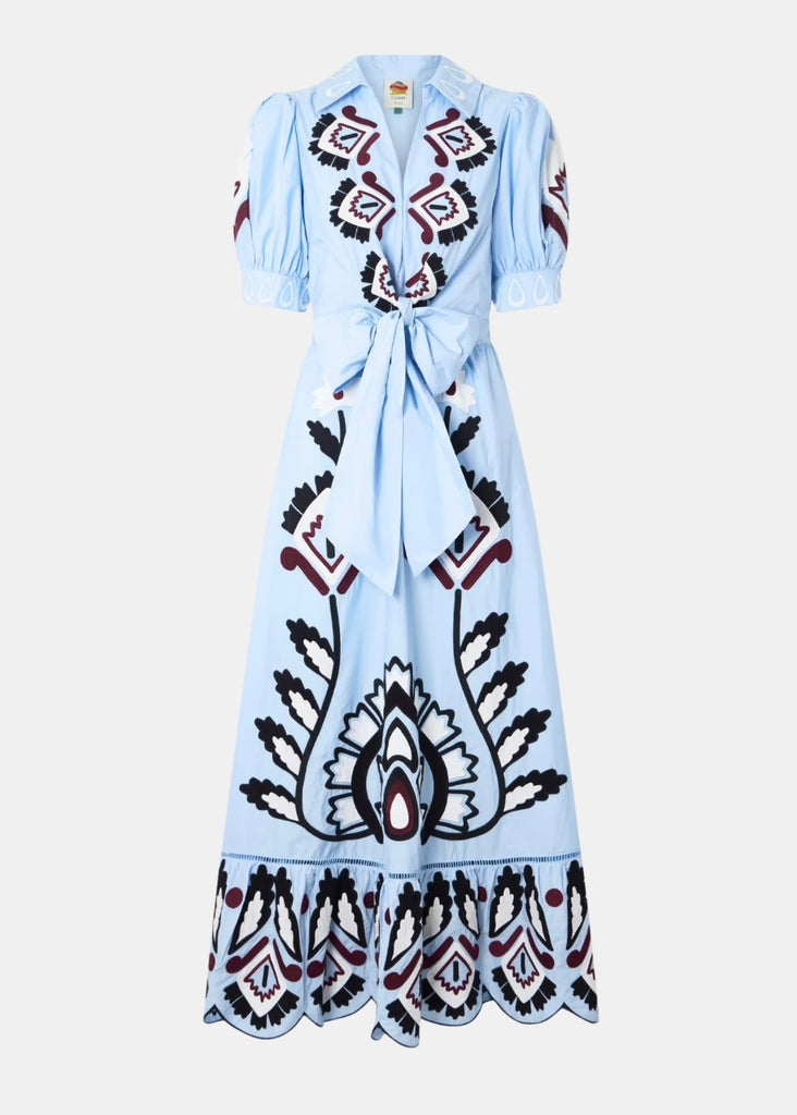 Embrace effortless elegance with this cotton maxi dress that features a delicate V neckline and intricate embroidery that dances across the bodice. The flowing silhouette is softened by a charming tie-waist bow, creating playful yet graceful movement.