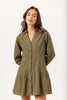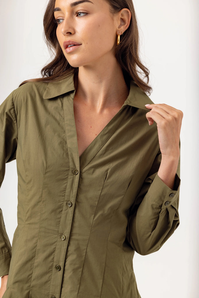 Designed with corset-style panel construction, this piece creates a flattering, fitted shape through the waist before flowing into a pleated skirt that finishes at a length of 34.25" inches for a size small. Greer is a button-up style designed with a V-neck and a classic collar features full-length sleeves complete with classic button cuffs.