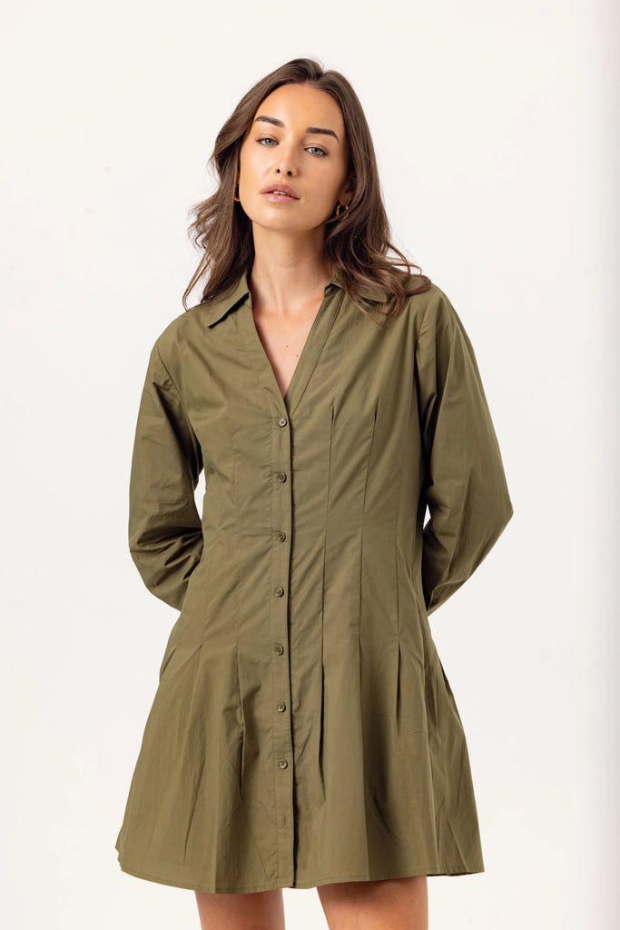 - 100% cotton poplin button up, corset-style paneling and pleated skirt dress