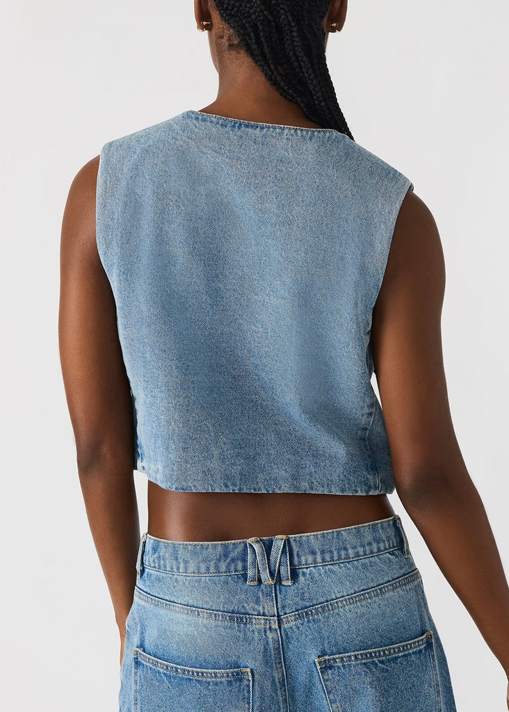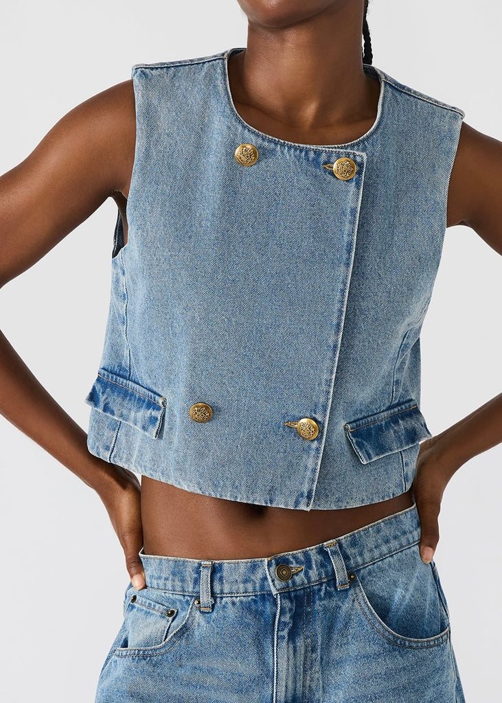 Light wash denim and gold-tone crest buttons complement the structured & cropped silhouette of this casual cool vest top.