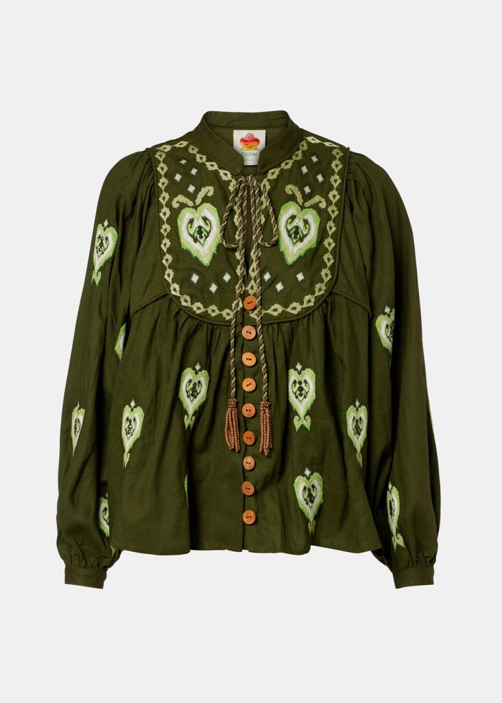Embrace vibrant spirit with this Green Embroidered Puff Sleeve Blouse from FARM Rio. It features a soft rounded, button-front V-neckline with ties and long, airy blouson sleeves. Intricate botanical embroidery & embellishments adds a playful, handcrafted touch, while the lush green hue celebrates nature’s energy. This top is a perfect blend of comfort and artistic charm, inviting joyful moments in every wear. Pair with the coordinating Embroidered Heart Shorts for an elevated, vacation-ready set.