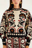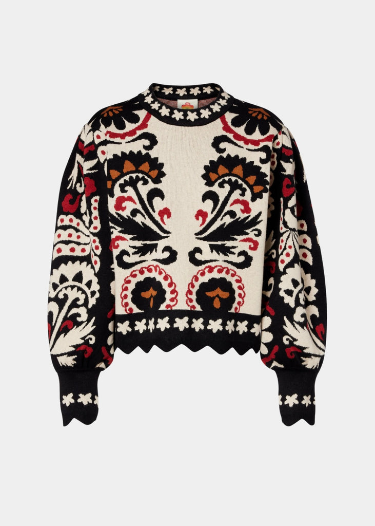Embrace cozy elegance with the Winter Tapestry Knit Sweater. Featuring a round neckline and voluminous puff sleeves, this knitwear masterpiece dazzles with its intricate tapestry-inspired motifs in warm hues of cream, black, rust, and red. The ornate patterns intertwine floral and abstract shapes, while the tailored silhouette and scalloped hem deliver a playful yet refined charm, perfect for embracing winter’s soft embrace in style.
