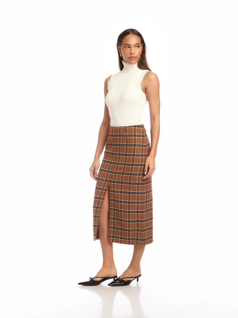 Crafted from soft brushed plaid, the Kaia Midi Skirt features a timeless check pattern with a sleek front slit. Its structured silhouette and midi length make it a standout for fall layering and beyond.