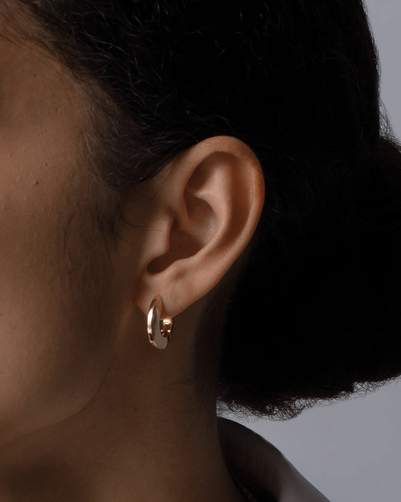 A custom, perfectly circular, small modern hoop. Opens and closes with a hinge. Pull at back hinge to open. Push to lock onto post and listen for a "click" to ensure it's locked properly. Dipped in 14k gold with a high polish.
