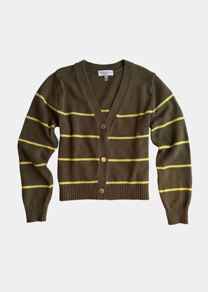 An easy classic with a subtle twist. This cotton-blend knit cardigan features a rich olive base accented with thin contrast stripes for just the right amount of visual interest. Designed with a flattering V-neckline, ribbed trim, and gold-toned button closures, it’s the kind of layer that works year-round—polished enough for work, relaxed enough for weekends.