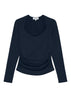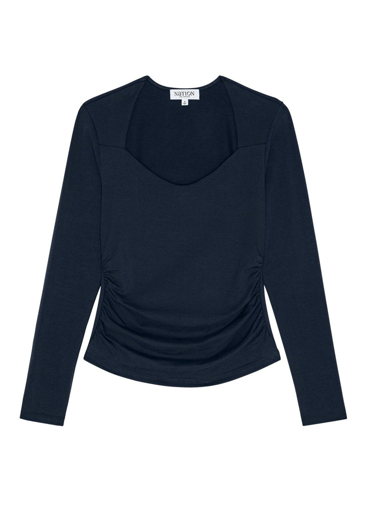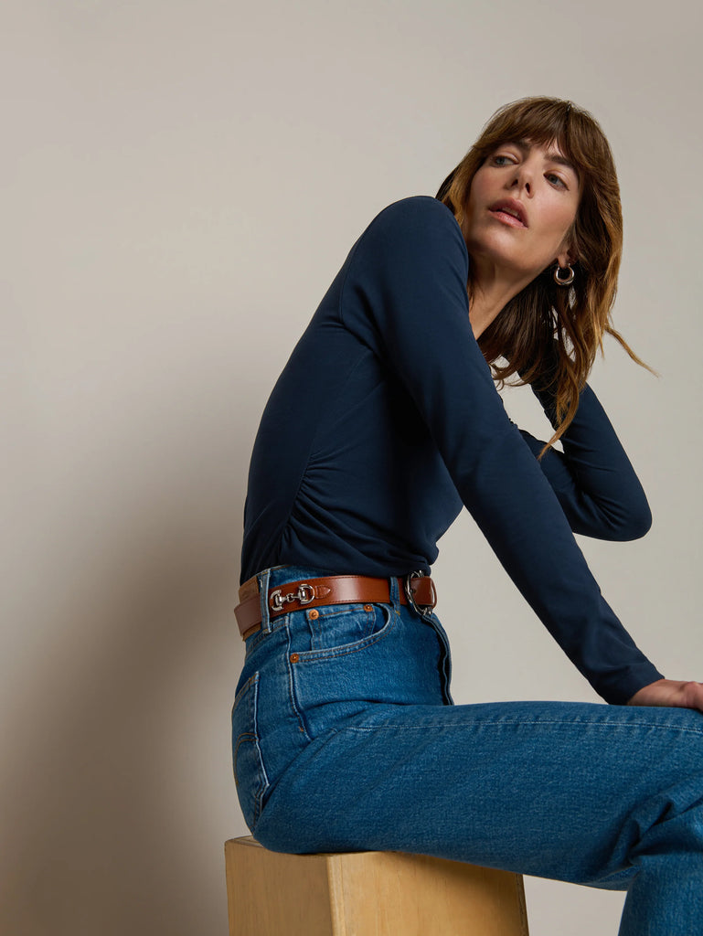 The Millie Tee is a fitted staple with just the right amount of stretch—made in pima pigment jersey for a close, comfortable feel. Shirring and a sweetheart neckline bring a feminine fit in all the right places. This one comes in Night Sky — a deep, almost black navy.
