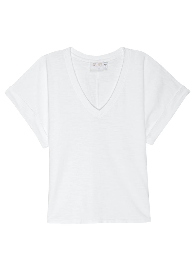 Details: Drop shoulder | V neckline | Cuffed, short sleeves | Bra friendly