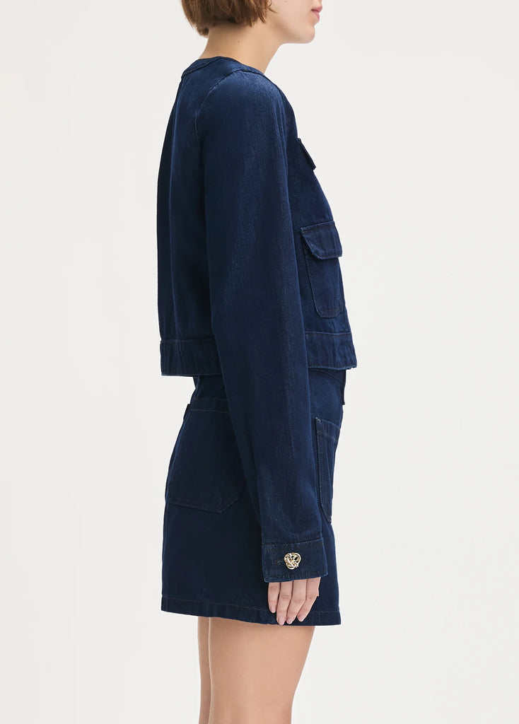 The Denim Emily Jacket is your new favorite cropped layer. Its slightly fitted silhouette features a round collar and button detail, plus a hidden snap placket. We especially love the dark blue Stout rinse with its subtle blue-black cast. For a denim-on-denim look, pair with The Mimi Mini Skirt.