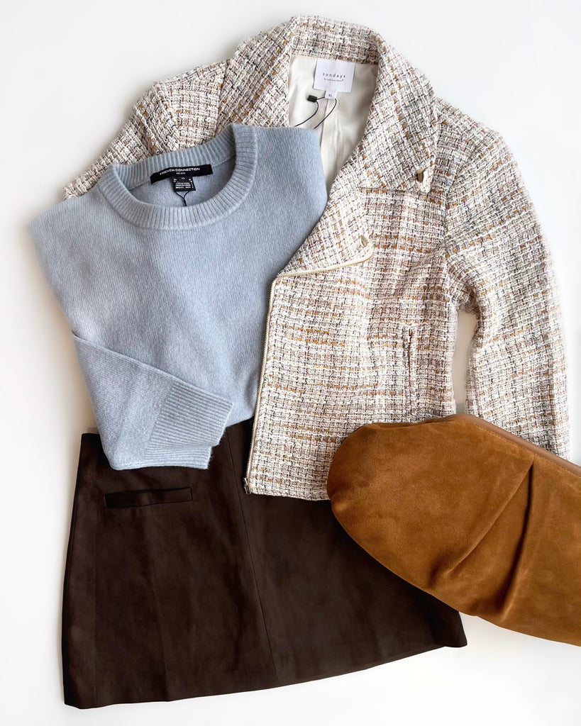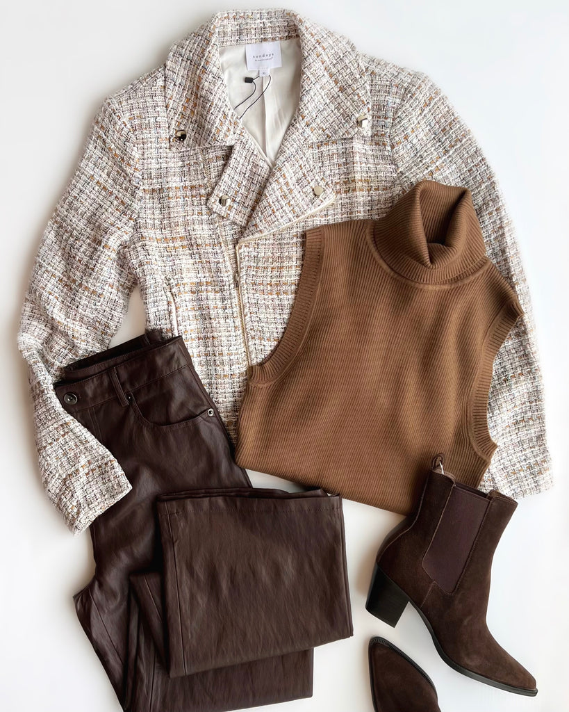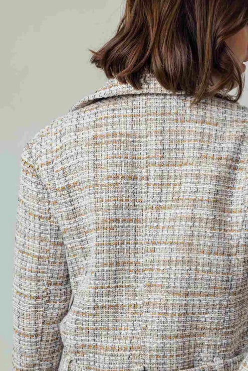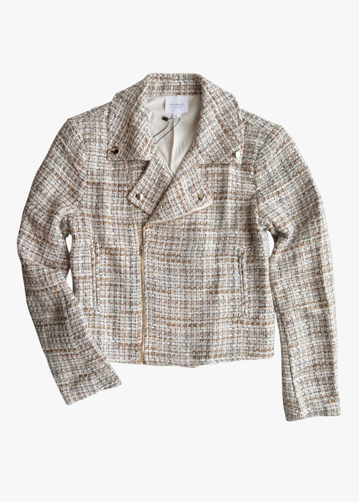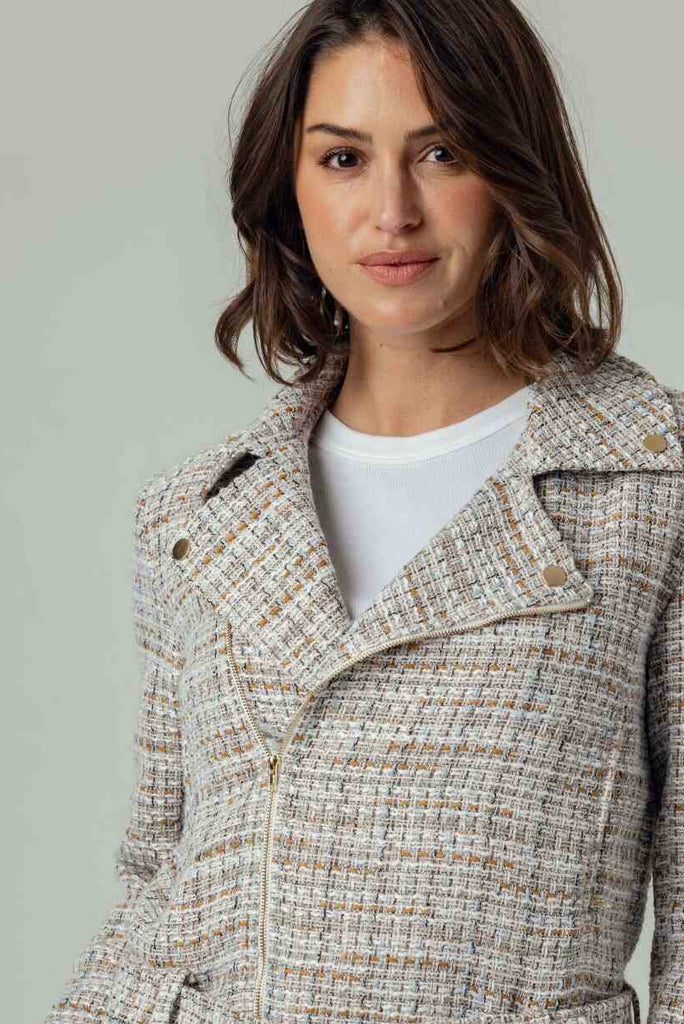 Classic boucle is refined and updated in this moto style cropped jacket with silver hardware and an asymmetrical zippered front. In a mix of blue, camel, ivory, rust and more — this jacket easily pairs with pants and skirts.