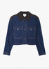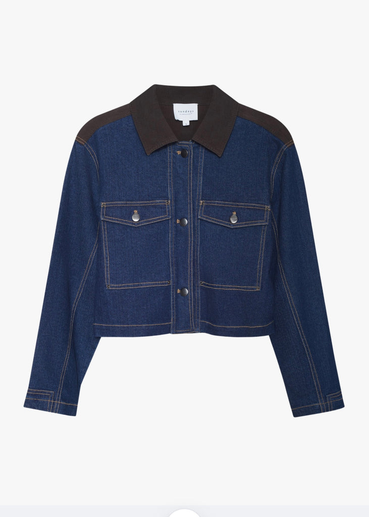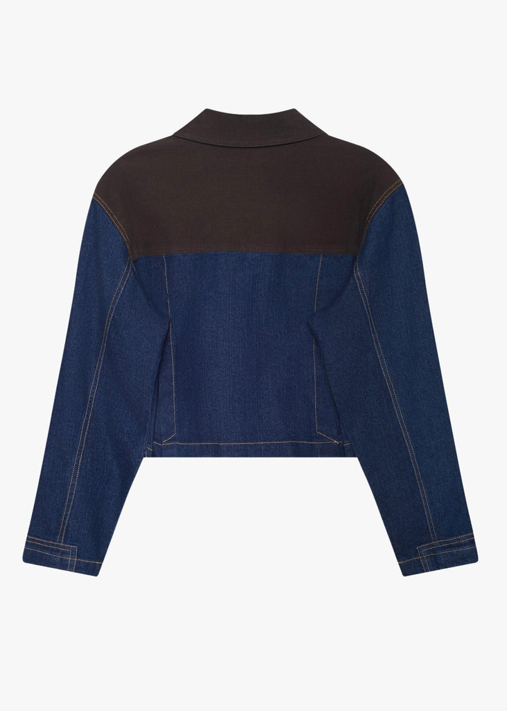 Crafted in 100% cotton dark-wash denim with corduroy accents at the collar and back yoke, this jacket is a modern twist on a classic. Designed with a button front, functional front pockets and contrast stitching for added detail, it features a boxy, slightly cropped fit that falls just below the belly button.