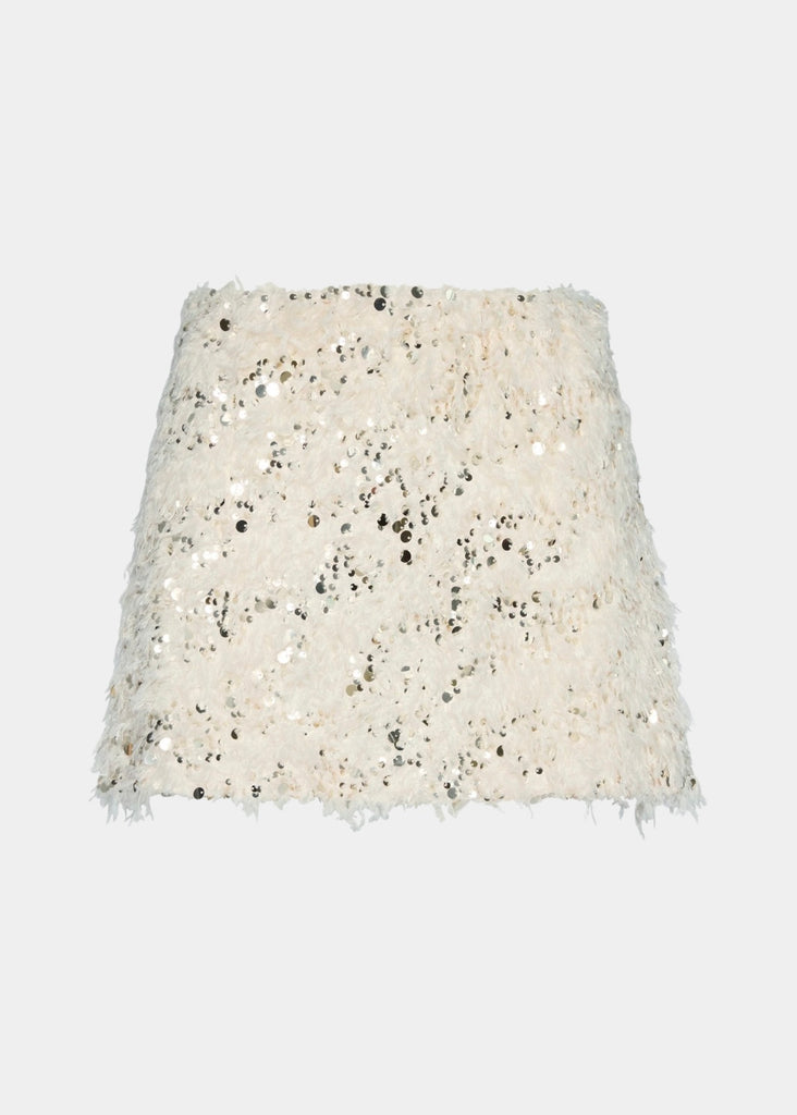 You'll be ready for your next night out in this flirty miniskirt embellished with dimensional sequins and feathery fringe. We love it paired with the Ivi Sweater for a fun, winter white look — or the Aster shirt in white for a polished & tailored, cool girl vibe.