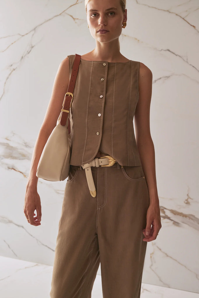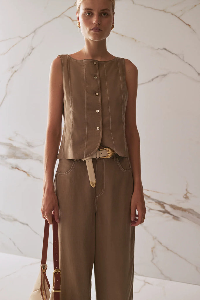 We love a vest style top. Sophisticated and tailored to perfection; the Klara Vest features a boat neckline and wide set straps. The panel lines of this garment are designed to sweep beautifully down the waist and brush over the top of the hips. Pairs perfectly with the Brixlynn Pants.