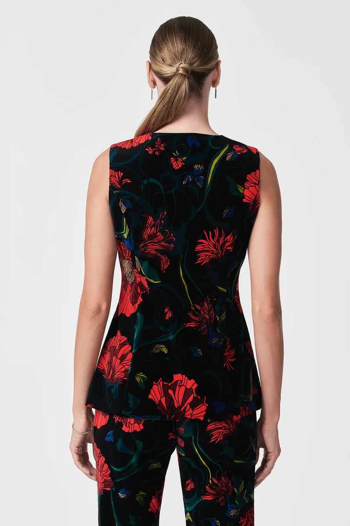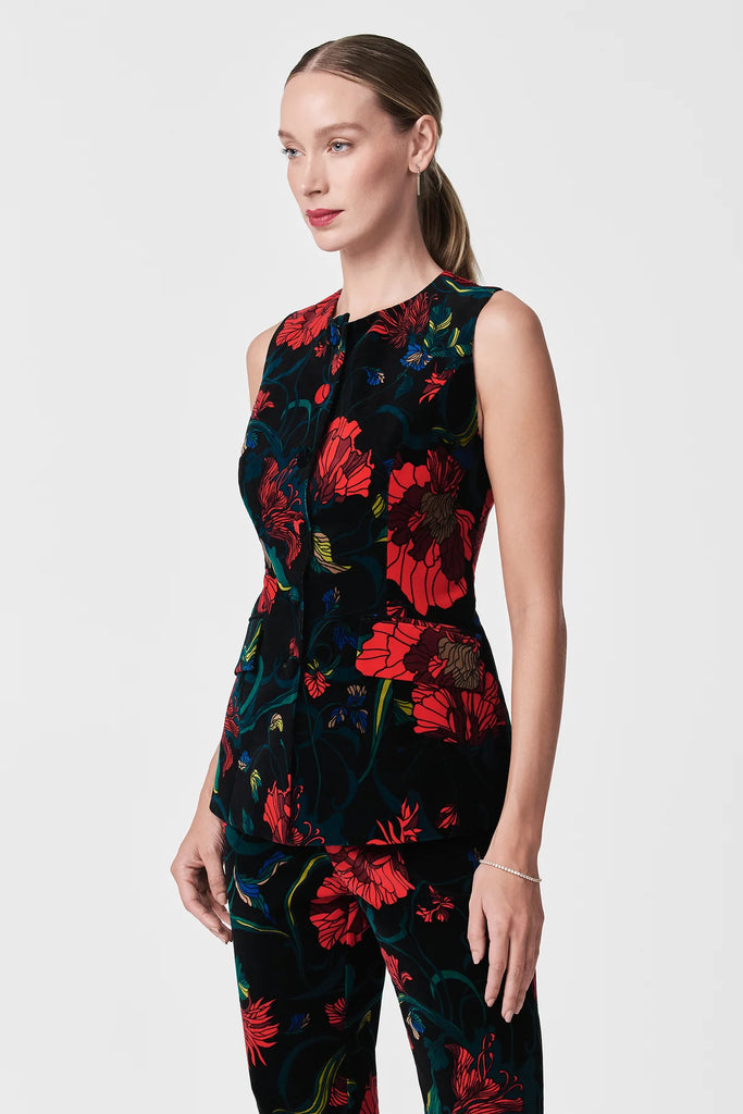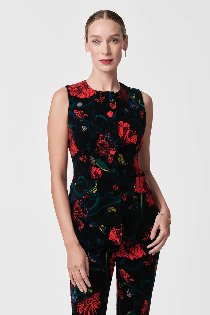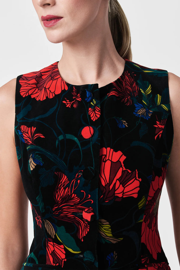 This sleeveless button-down top will add polish and sophistication to your holiday wardrobe. Featuring a bold floral print on cotton velveteen, this top is finished with self-covered center front buttons, functional pockets, and princess seams. Wear it with our matching pants for a complete look.