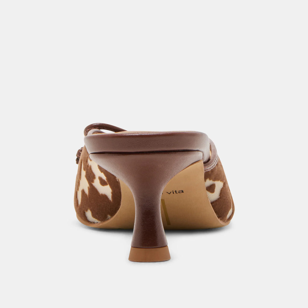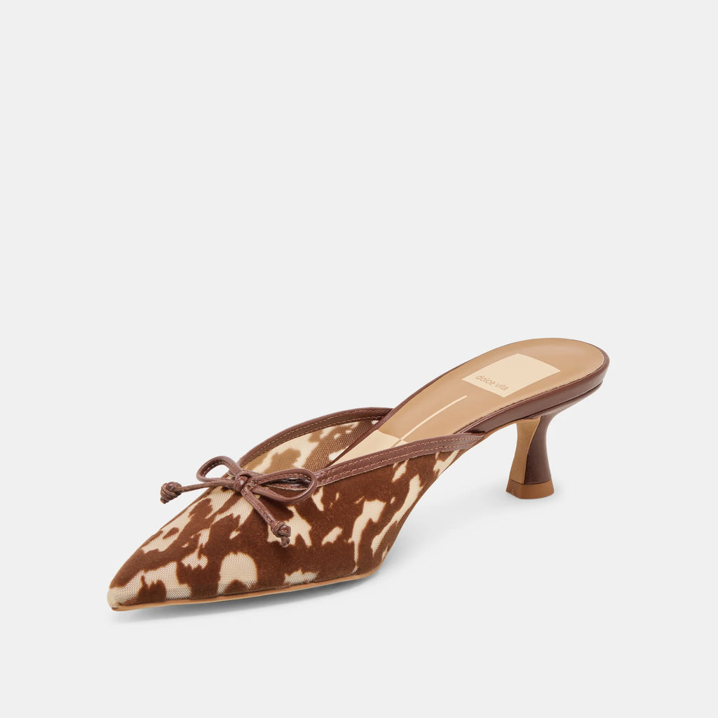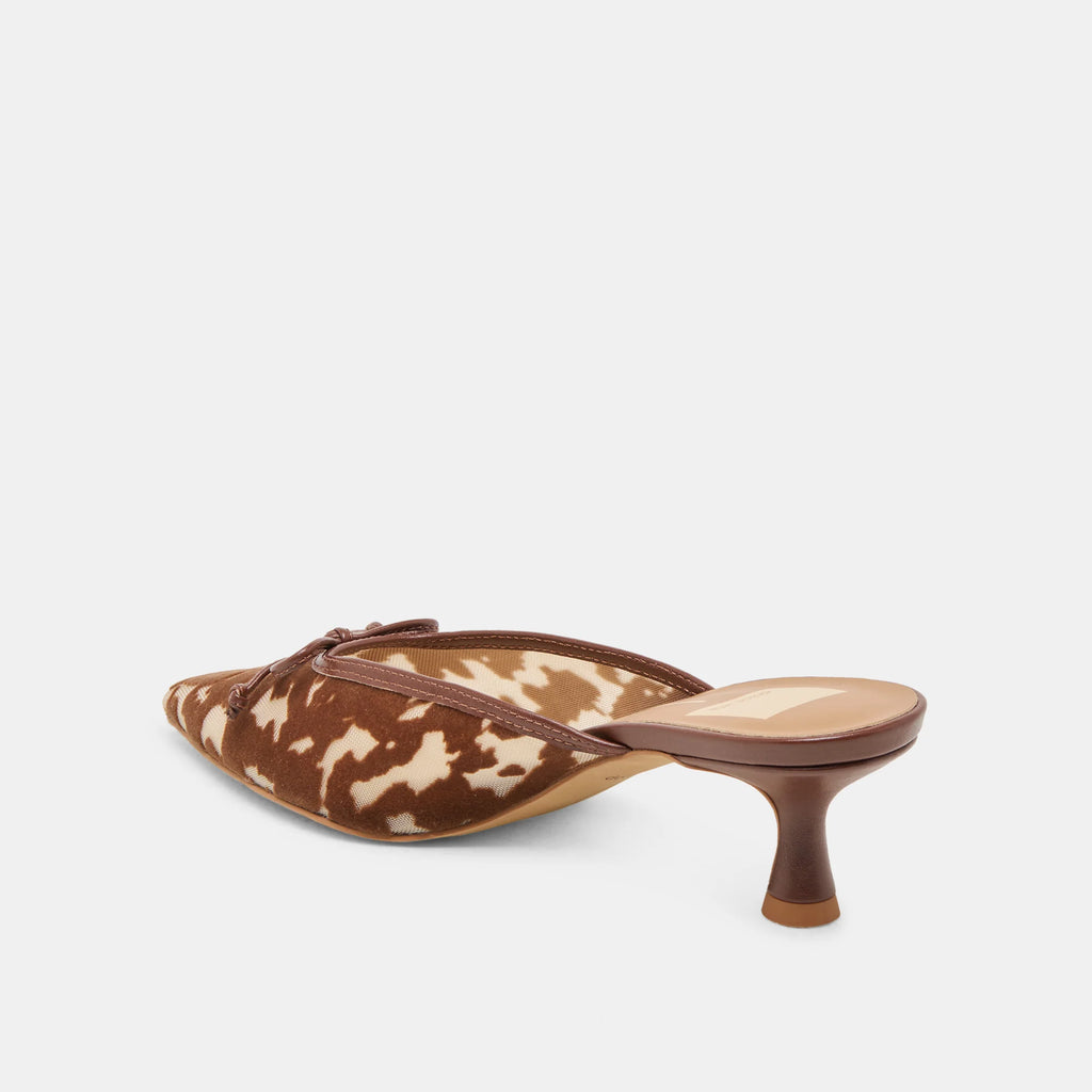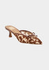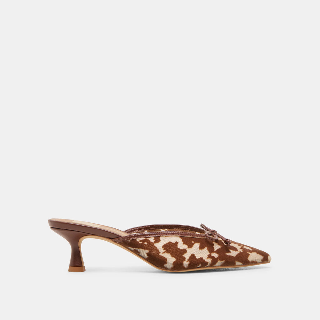 Cleo is an on-trend take on a classic style. Her sharp silhouette and architectural kitten heel are made modern with cow print on airy mesh. Style this fashion-forward mule with dressed up closet staples.