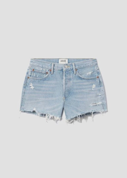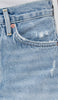 Looks Like: Bright indigo denim short with fading, whiskering, marbling and distressing