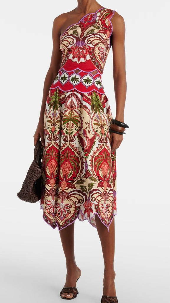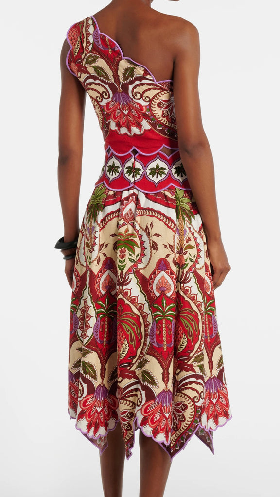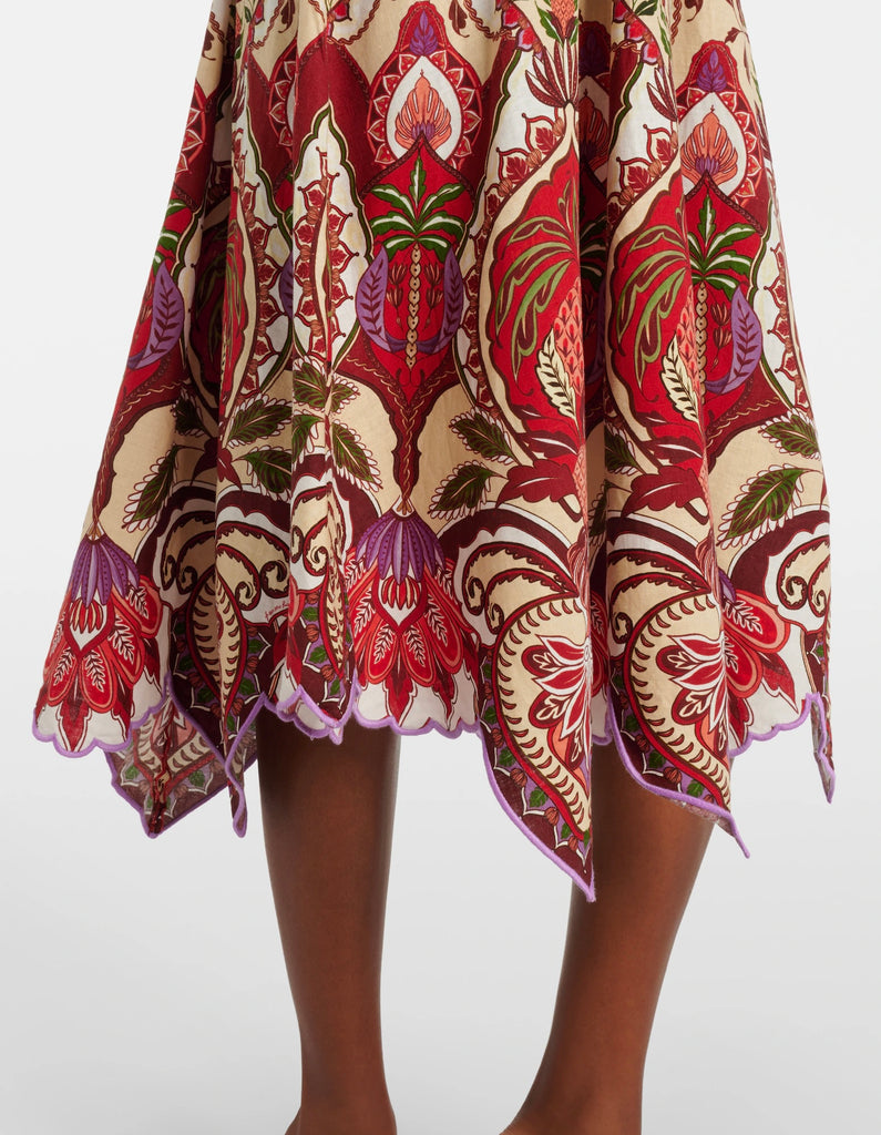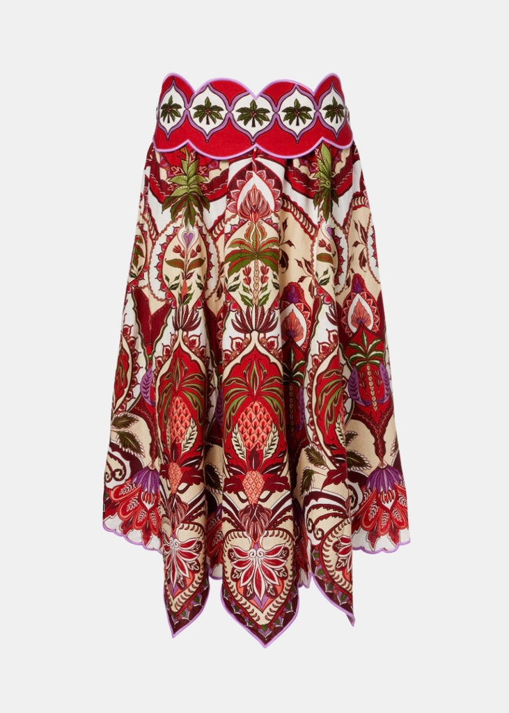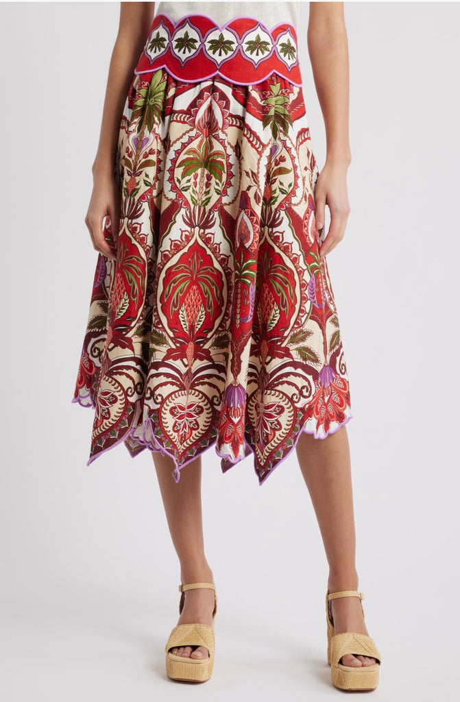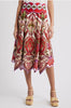 Scalloped details crown a flowing silhouette in this vibrant midi skirt drawn from sun-drenched tropical inspiration and styled for effortless movement with a handkerchief hemline. Pair with the coordinating Odara Crop Top for a vacation-ready set.