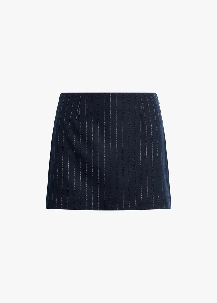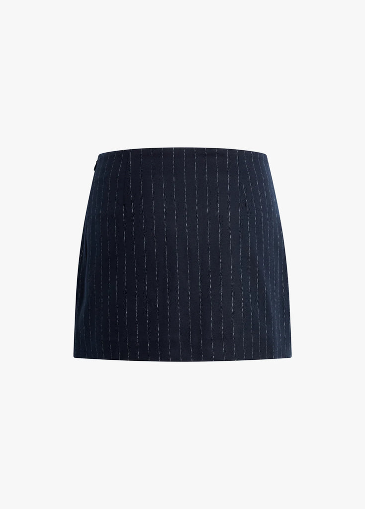 The Favorite Skort in Navy Pinstripe has an easy, elevated waist that falls straight from hip to hem with built-in shorts. Cut from a structured suiting blend that pairs perfectly with blouses and knits alike.