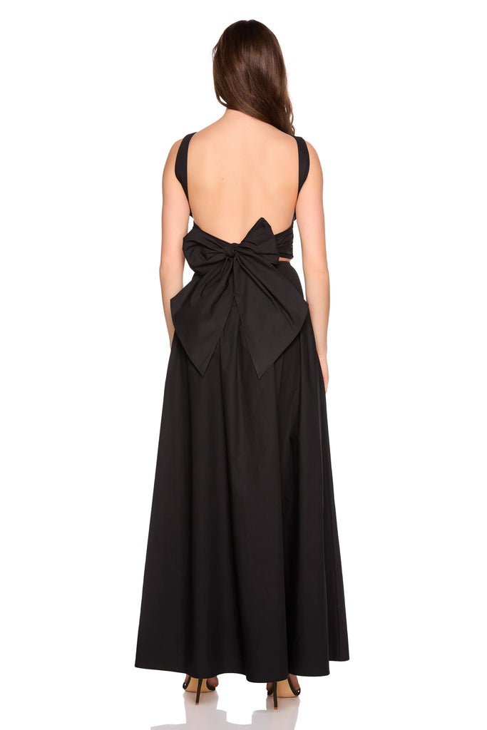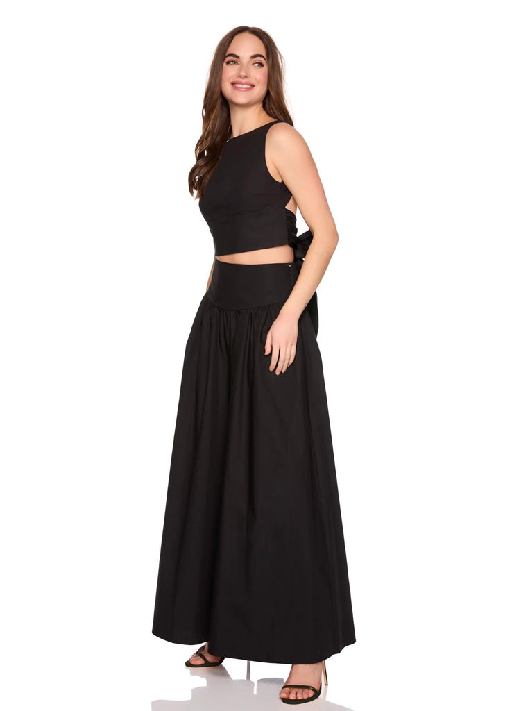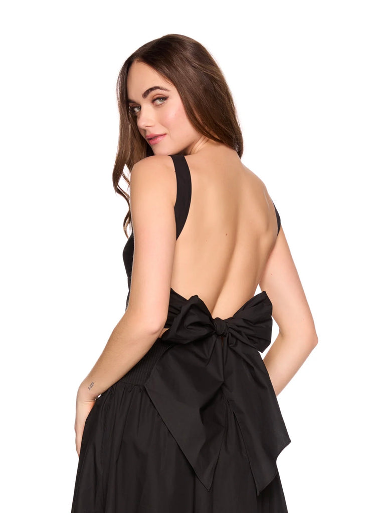 This Susana Monaco poplin top redefines contemporary elegance with its saturated black hue and crisp, structured silhouette. Crafted from a lightweight, non-stretch cotton poplin, it offers a refined yet playful aesthetic. The design is subtly chic from the front with a classic boat neck, revealing a striking open back that culminates in an oversized, dramatic tie-back detail, creating a captivating visual. Perfectly suited for warm weather, this cropped piece is ideal for pairing with high-waisted denim/trousers or skirts for a sophisticated, modern ensemble, whether for a daytime outing or an evening gathering. We love it paired with the coordinating Poplin Drop Waist Maxi Skirt for a chic set, that'll stand the test of time.