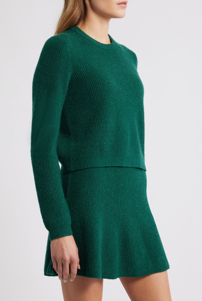 Minimalist, but make it cozy. The Vhari Knit Classic Sweater is your effortless go-to—crafted from a recycled-poly rib knit with a crew neckline and a just-right fit. Pair with denim or make it a monochromatic set with the matching Vhari knit miniskirt in evergreen.