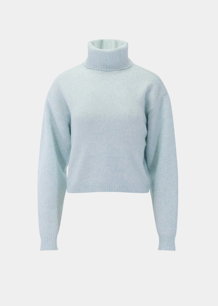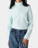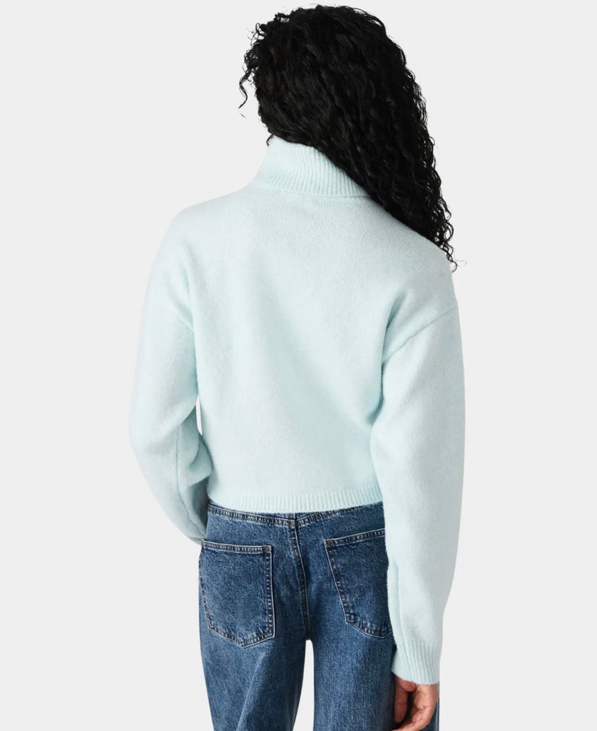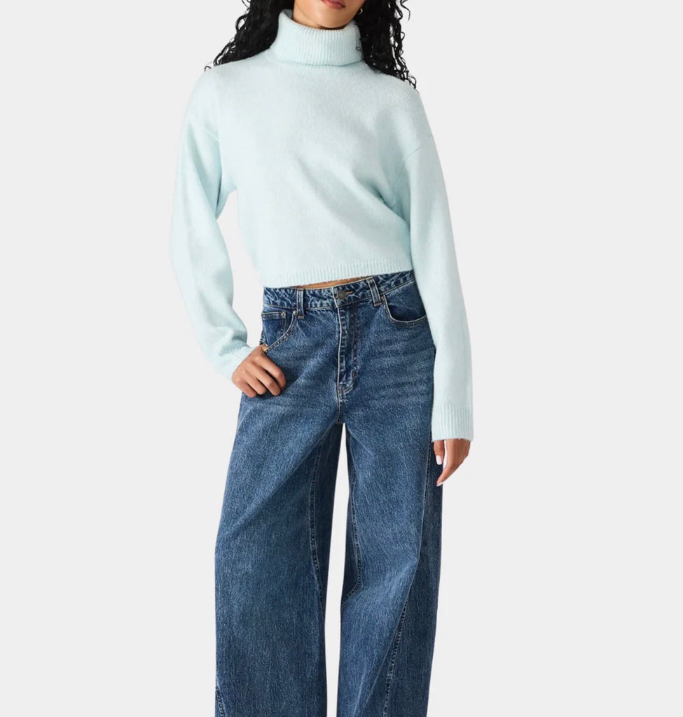 This Steve Madden Raegann Sweater features a classic turtleneck and long sleeves in a serene powder blue shade, offering understated elegance and layering versatility.