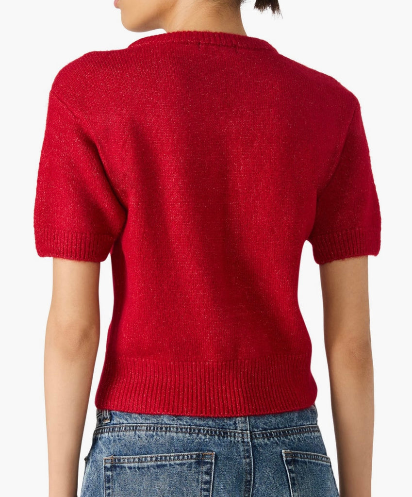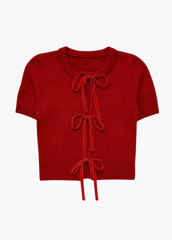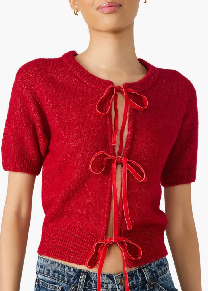 Dainty velvet ties tether the open front of this close-fitting cardigan knit in a cool cropped fit.