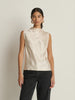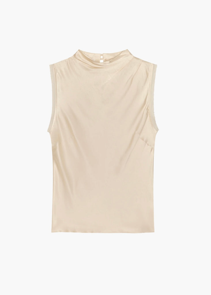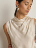 Minimal yet memorable, the Delilah Tank brings a refined edge to any wardrobe, made of hammered satin in our classic signature fit. A cowl neck, raw edge finish, and button-back keyhole closure add soft structure to this sleeveless silhouette—one you’ll want to keep on well after hours. (This one comes in Moonbeam). We love it paired with the coordinating Mabel skirt for a chic, tonal look or with denim/trousers.