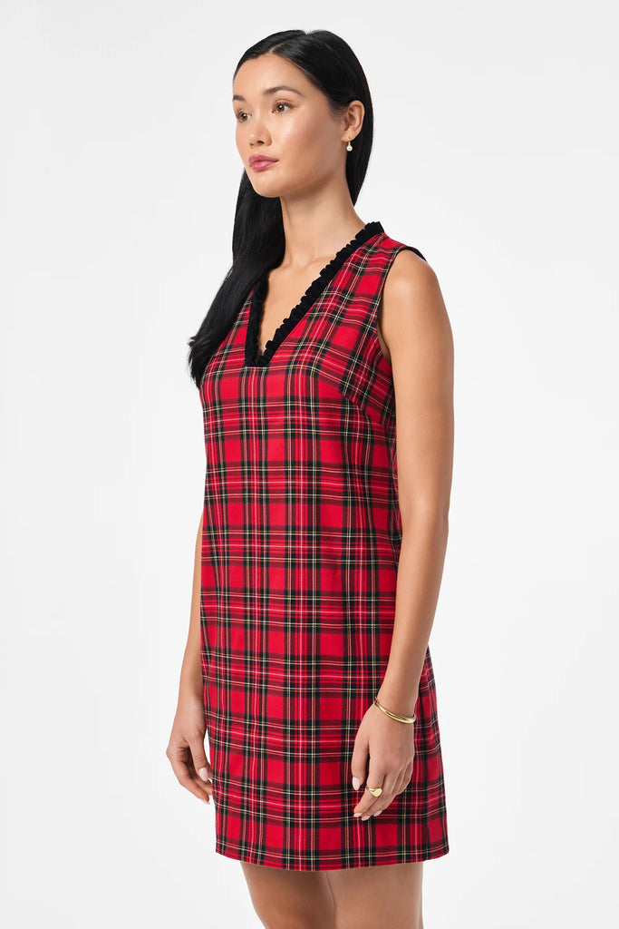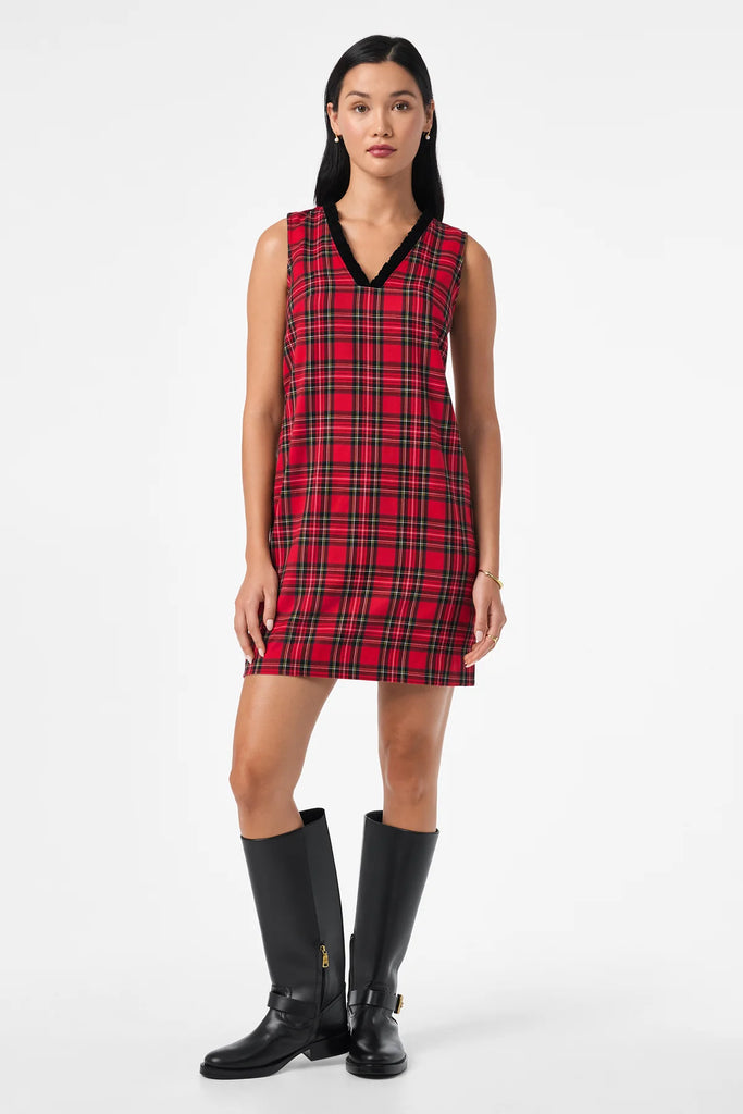 Perfect for holiday dressing and pretty-preppy styling, this red plaid dress will become a favorite statement piece. Made of yarn-dyed stretch woven plaid, this mini dress features a V-neck, velveteen trim at the neckline, and a center back invisible zip and hook and eye closure.