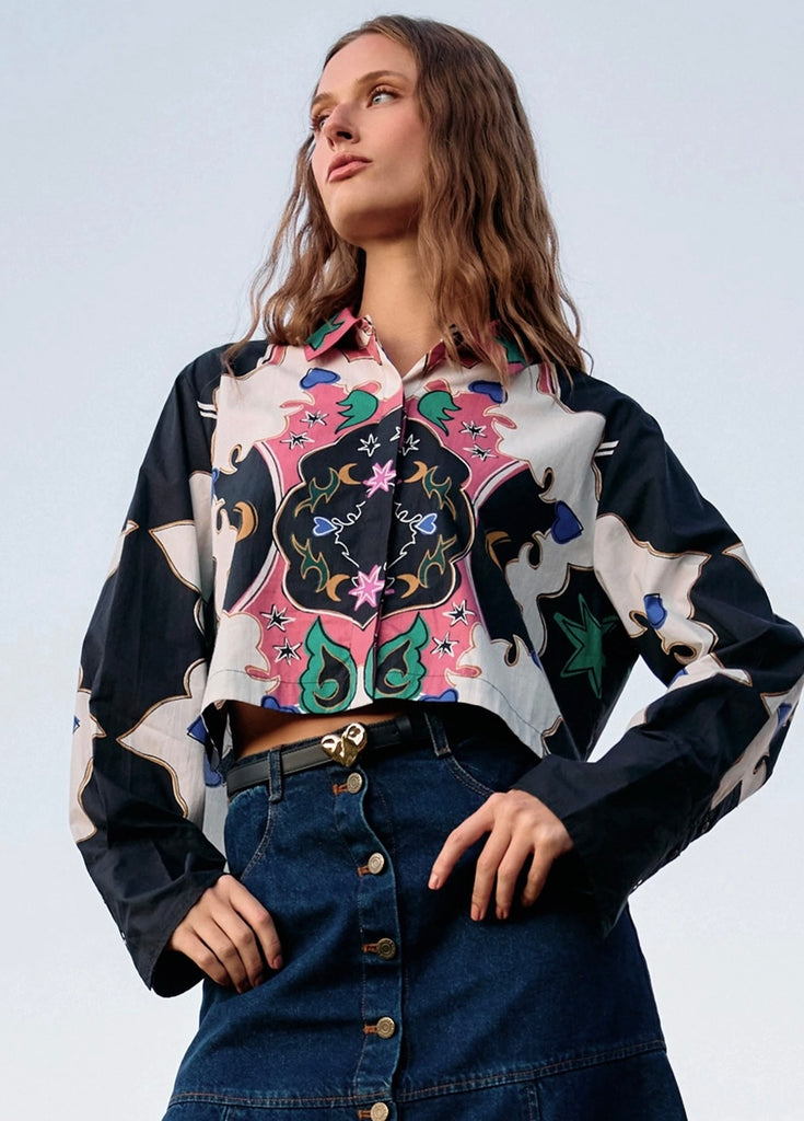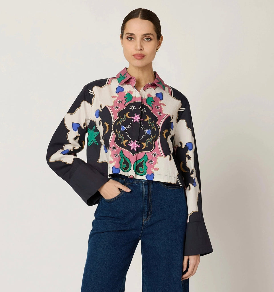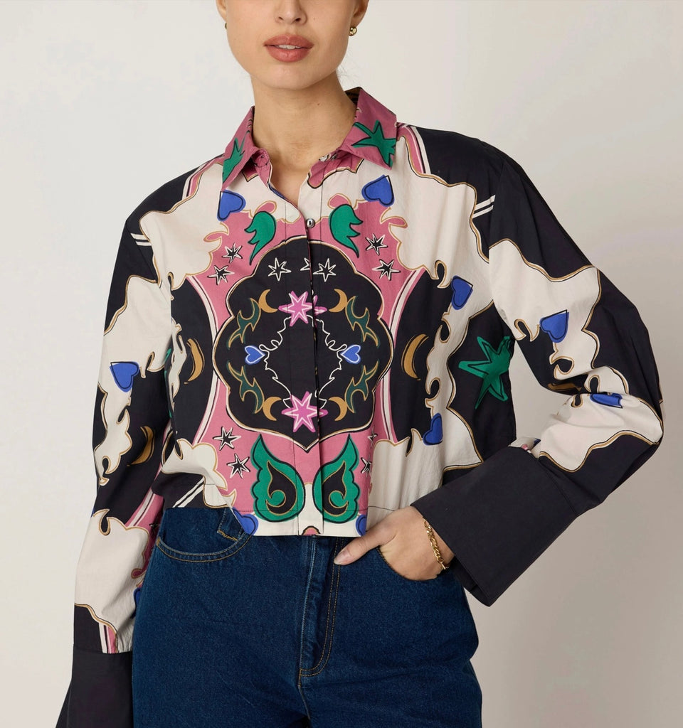 The Zoya Blouse brings effortless sophistication to your sustainable wardrobe. This long-sleeve button-down top features an elegant collar, extended cuffs, and an artful print that adds a bold yet refined touch. Pair it with your favorite bottoms for a polished, statement-making look that transitions seamlessly from day to night.