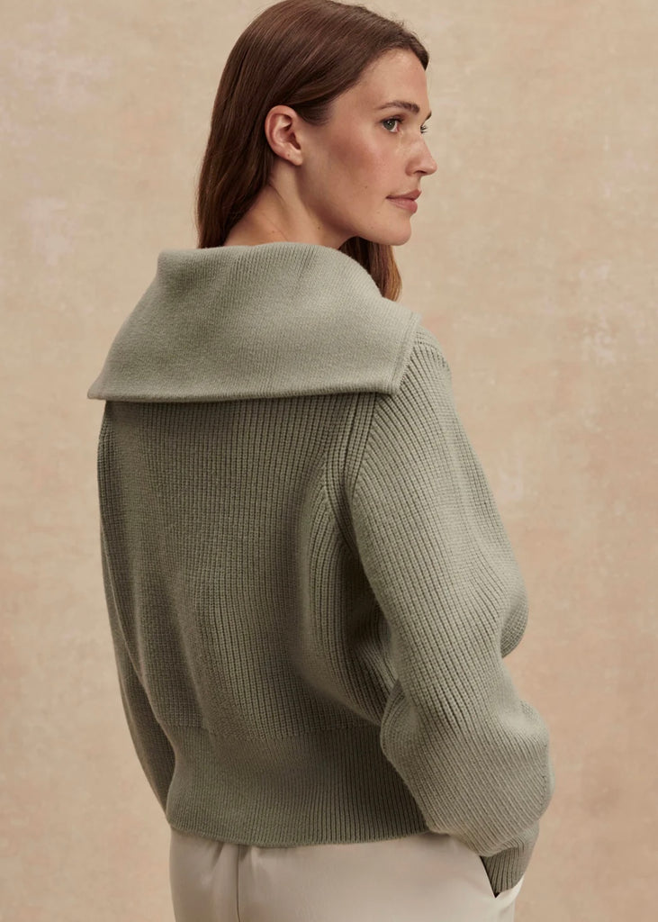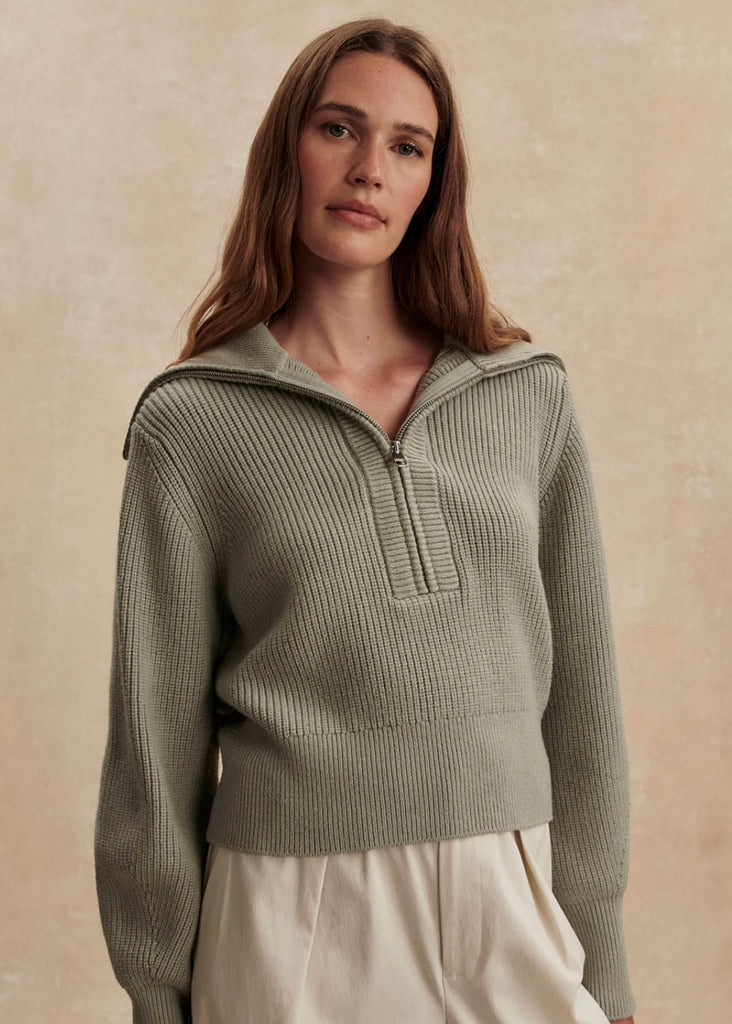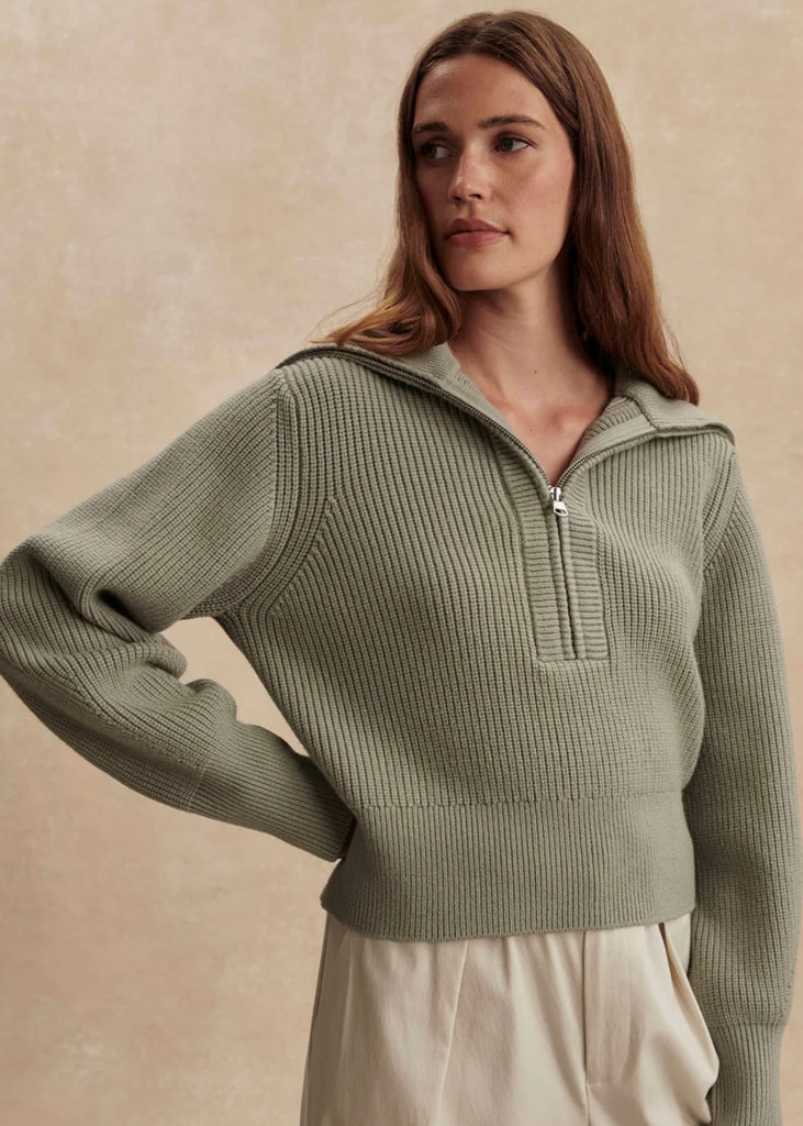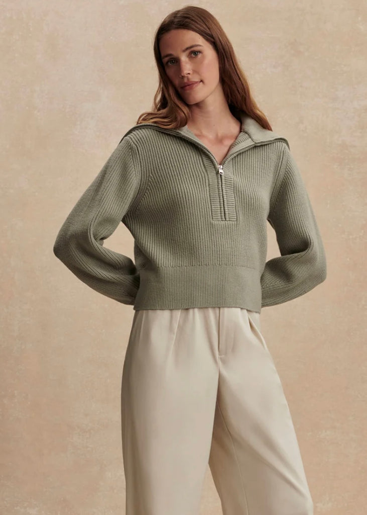 A versatile knit for all-season layering, the Maura is a contemporary half-zip style made to elevate your cold weather looks. A sweater version of the Enrico jacket, it is crafted from a mid-gauge Soft Viscose yarn, which makes it soft to the touch and super comfortable to wear all day. Complete with a classic turn-back collar and fashioned detailing to the arms. We love it paired with the Extra Wide Leg Pant 29.5" in Olive Marl.