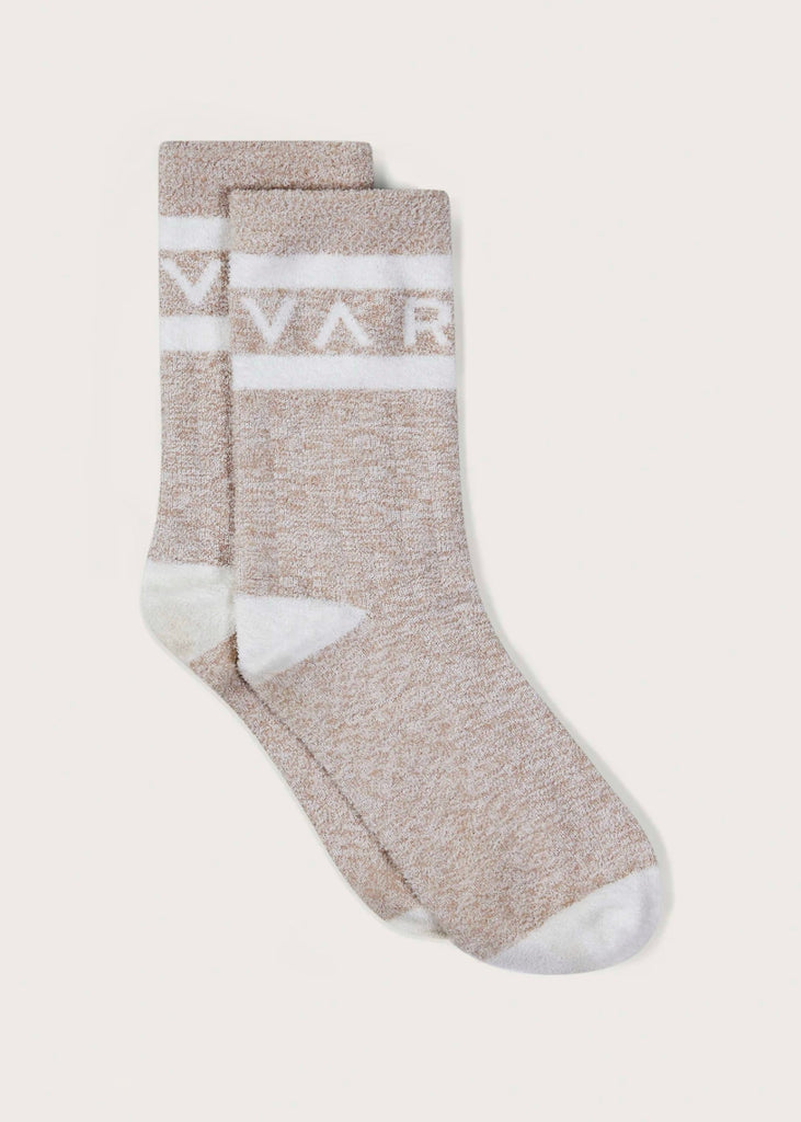 Woven in a bouclé-effect yarn, the Spencer socks feature a marled effect, a classic Varley logo stripe and contrast heel and toe.