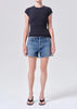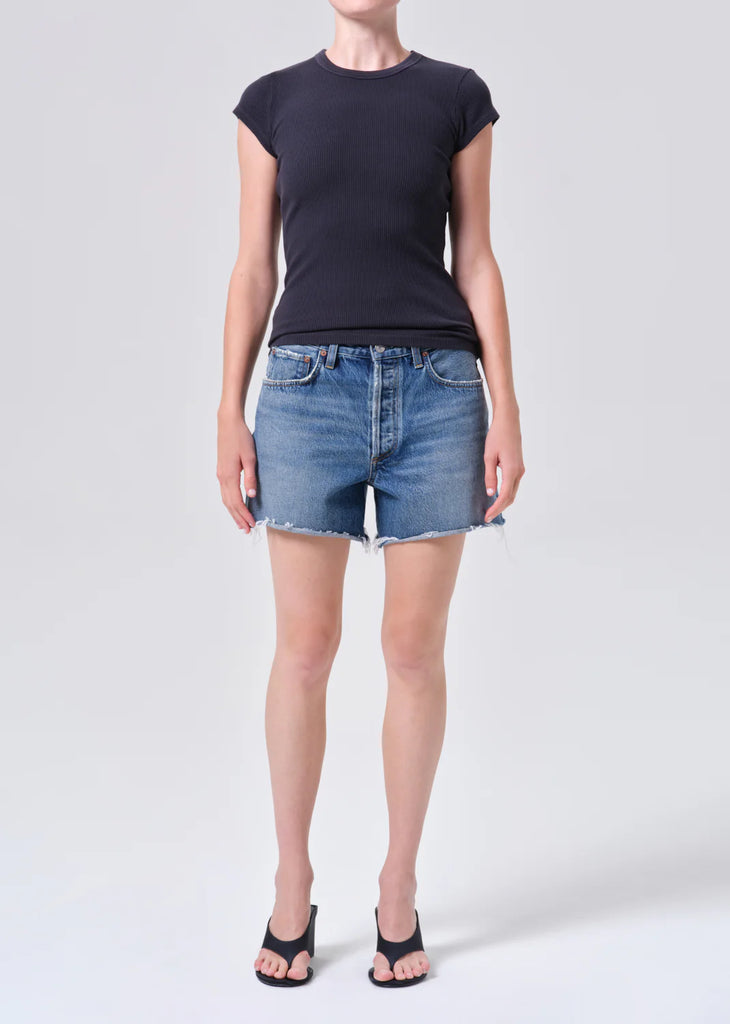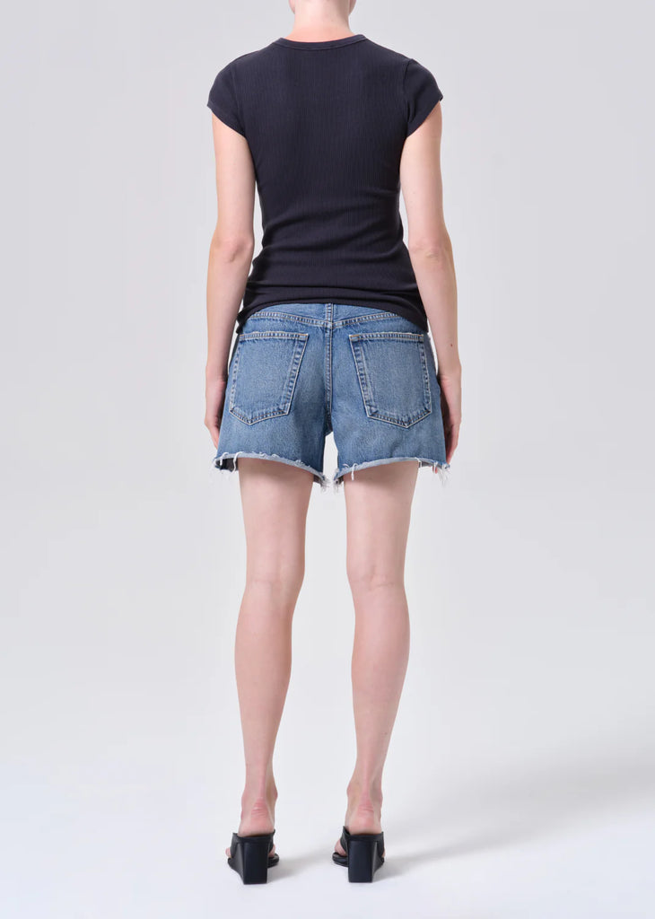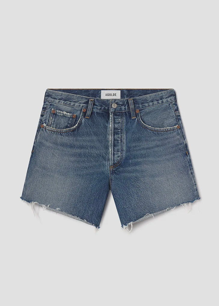 Our most relaxed short, the Nye is designed with a loose, low-slung fit and a subtle drop crotch for a true borrowed-from-the-boys feel. Rendered in a medium classic washed indigo, it features raw hems and generous five-pocket detailing, giving it an easy, authentically vintage attitude. Meant to be worn low on the hips, this silhouette delivers a laid-back, effortlessly cool look every time. Crafted from rigid non-stretch 100% regenerative cotton denim with a soft hand feel, it offers all-day wearability while maintaining its crisp, structured shape.